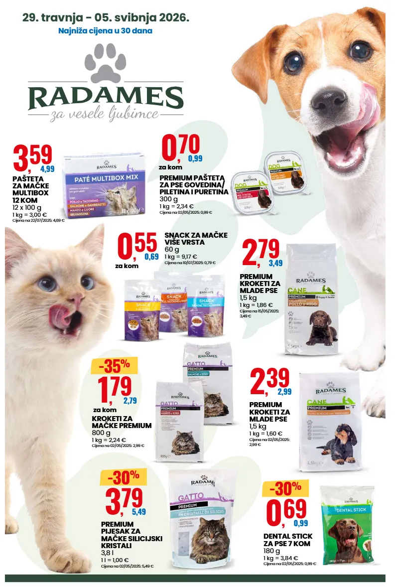 29. travnja - 05. svibnja 2026. najniža cijena u 30 dana 3 , 59 4,99 pašteta za mačke multibox 12 kom 12 x 100 g 1 kg = 3,00 € cijena na 22/07/2025: 4,69 € 0 , 55 0,69 za kom snack za mačke više vrsta 60 g 1 kg = 9,17 € cijena na 10/07/2025: 0,79 € 2 , 39 2,99 premium kroketi za mlade pse 1,5 kg 1 kg = 1,60 € cijena na 02/05/2025: 2,99 € 2 , 79 3,49 premium kroketi za mlade pse 1,5 kg 1 kg = 1,86 € cijena na 15/05/2025: 3,49 € 1 , 79 2,79 za kom -35 % kroketi za mačke premium 800 g 1 kg = 2,24 € cijena na 02/05/2025: 2,99 € 0 , 70 0,99 za kom premium pašteta za pse govedina/ piletina i puretina 300 g 1 kg = 2,34 € cijena na 02/05/2025: 0,99 € 0 , 69 0,99 -30 % dental stick za pse 7 kom 180 g 1 kg = 3,84 € cijena na 02/05/2025: 0,99 € 3 , 79 5,49 -30 % premium pijesak za mačke silicijski kristali 3,8 l 1 l = 1,00 € cijena na 02/05/2025: 5,49 €
