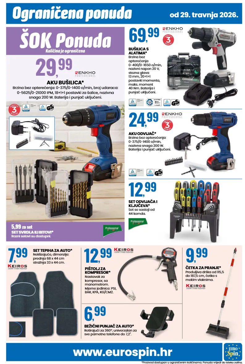www.eurospin.hr ograničena ponuda *proizvod dostupan u ograničenim količinama. ponuda vrijedi do isteka zaliha. od 29. travnja 2026. aku bušilica* brzina bez opterećenja: 0-375/0-1400 o/min, broj udaraca: 0-5625/0-21000 ipm, 18+1+1 postavki za šalice, nazivna snaga 200 w. baterija i punjač uključeni. 29 , 99 aku odvijač* brzina bez opterećenja: 0-375/0-1400 o/min, nazivna snaga 200 w. baterija i punjač uključeni. 24 , 99 bušilica s alatima* brzina bez opterećenja 0-400/0-1650 o/min, nazivni napon 20 v, stezna glava 13 mm, 20+1+1 postavki momenta, maks. moment 40 nm. baterija i punjač uključeni. 69 , 99 set odvijača i ključeva* set se sastoji od 44 komda. 12 , 99 bežični punjač za auto* rotirajući za 360°, univerzalan za sve pametne telefone do 7,2". 6 , 99 set tepiha za auto* neklizajuće, dimenzije: prednja 68 x 44 cm stražnja 33 x 44 cm. 7 , 99 pištolj za kompresor* nastavak za kompresor, sa manometrom. mjerne jedinice: psi, bar, kpa, kg/cm2. 12 , 99 četka za pranje* produljiva drška od 115,5 do 187,5 cm, četka s mekim vlaknima. 9 , 99 5,99 za set set svrdla ili bitovi* razni setovi su dostupni.