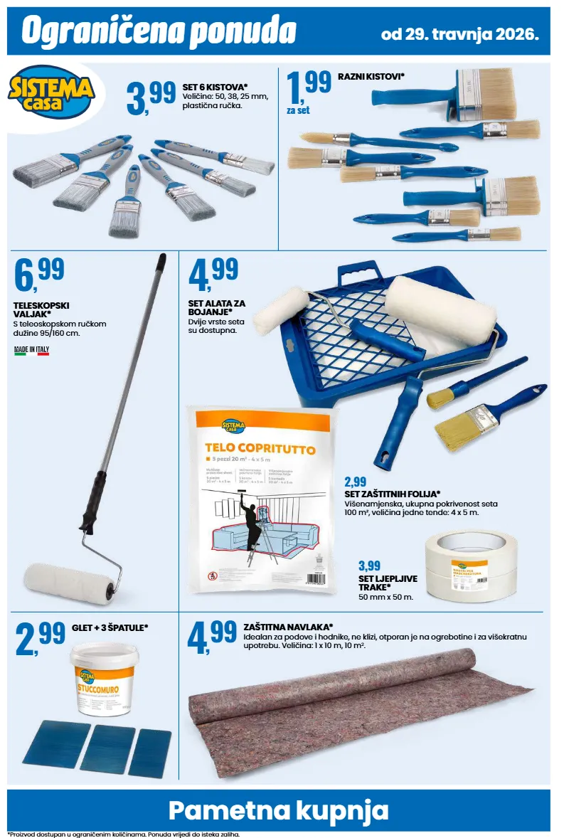 Pametna kupnja Ograničena ponuda *Proizvod dostupan u ograničenim količinama. Ponuda vrijedi do isteka zaliha. od 29. travnja 2026. GLET + 3 ŠPATULE* 2 , 99 SET ALATA ZA BOJANJE* Dvije vrste seta su dostupna. 4 , 99 TELESKOPSKI VALJAK* S teleoskopskom ručkom dužine 95/160 cm. 6 , 99 3,99 SET LJEPLJIVE TRAKE* 50 mm x 50 m. ZAŠTITNA NAVLAKA* Idealan za podove i hodnike, ne klizi, otporan je na ogrebotine i za višekratnu upotrebu. Veličina: 1 x 10 m, 10 m 2 . 4 , 99 RAZNI KISTOVI* 1 , 99 za set 2,99 SET ZAŠTITNIH FOLIJA* Višenamjenska, ukupna pokrivenost seta 100 m², veličina jedne tende: 4 x 5 m. SET 6 KISTOVA* Veličine: 50, 38, 25 mm, plastična ručka. 3 , 99