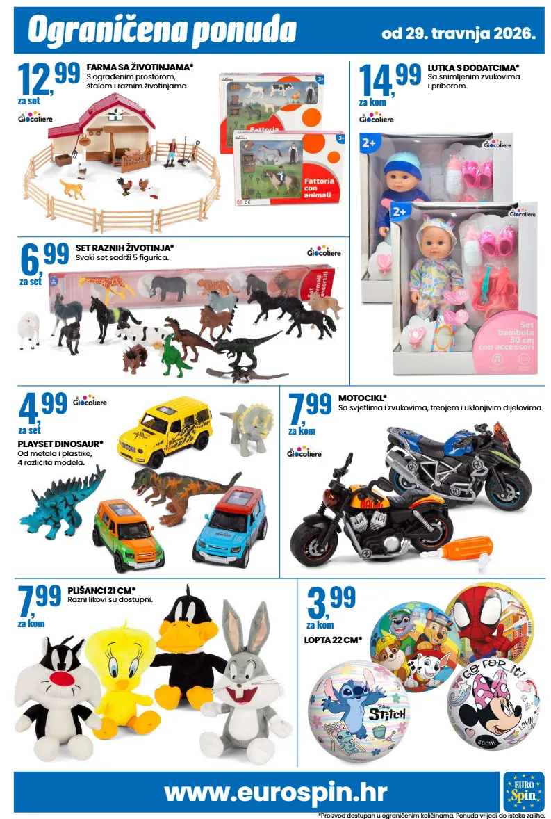 www.eurospin.hr ograničena ponuda *proizvod dostupan u ograničenim količinama. ponuda vrijedi do isteka zaliha. od 29. travnja 2026. 12 , 99 za set farma sa životinjama* s ograđenim prostorom, štalom i raznim životinjama. motocikl* sa svjetlima i zvukovima, trenjem i uklonjivim dijelovima. 7 , 99 za kom lutka s dodatcima* sa snimljenim zvukovima i priborom. 14 , 99 za kom plišanci 21 cm* razni likovi su dostupni. 7 , 99 za kom lopta 22 cm* 3 , 99 za kom 6 , 99 za set set raznih životinja* svaki set sadrži 5 figurica. playset dinosaur* od metala i plastike, 4 različita modela. 4 , 99 za set