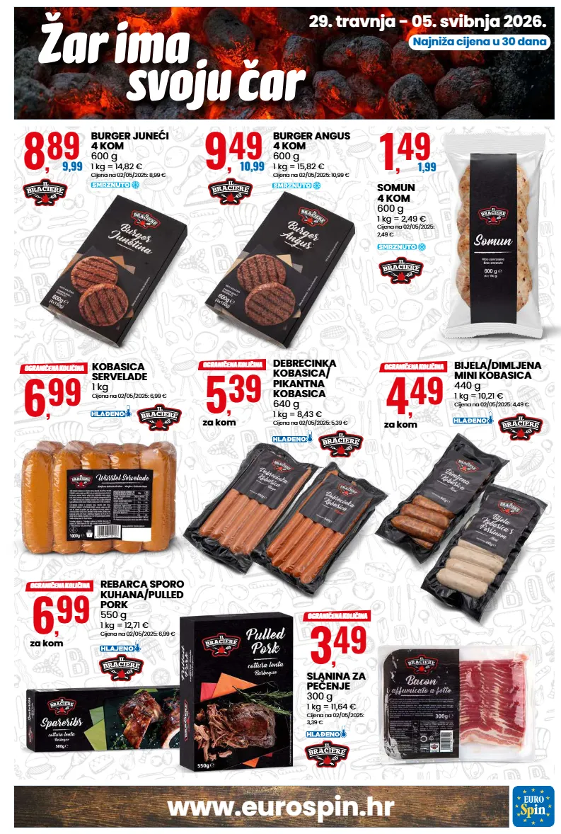 29. travnja - 05. svibnja 2026. www.eurospin.hr najniža cijena u 30 dana 8 , 89 9,99 burger juneći 4 kom 600 g 1 kg = 14,82 € cijena na 02/05/2025: 8,99 € 9 , 49 10,99 burger angus 4 kom 600 g 1 kg = 15,82 € cijena na 02/05/2025: 10,99 € 1 , 49 1,99 somun 4 kom 600 g 1 kg = 2,49 € cijena na 02/05/2025: 2,49 € 6 , 99 ograničena količina kobasica servelade 1 kg cijena na 02/05/2025: 6,99 € 5 , 39 za kom ograničena količina debrecinka kobasica/ pikantna kobasica 640 g 1 kg = 8,43 € cijena na 02/05/2025: 5,39 € 4 , 49 za kom ograničena količina bijela/dimljena mini kobasica 440 g 1 kg = 10,21 € cijena na 02/05/2025: 4,49 € 6 , 99 za kom ograničena količina rebarca sporo kuhana/pulled pork 550 g 1 kg = 12,71 € cijena na 02/05/2025: 6,99 € 3 , 49 ograničena količina slanina za pečenje 300 g 1 kg = 11,64 € cijena na 02/05/2025: 3,39 €