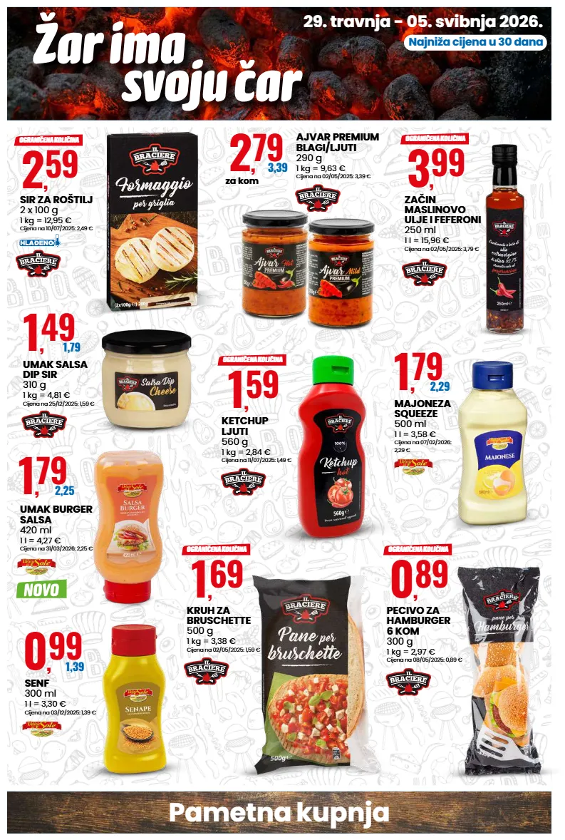 29. travnja - 05. svibnja 2026. pametna kupnja najniža cijena u 30 dana 3 , 99 ograničena količina začin maslinovo ulje i feferoni 250 ml 1 l = 15,96 € cijena na 02/05/2025: 3,79 € 2 , 79 3,39 za kom ajvar premium blagi/ljuti 290 g 1 kg = 9,63 € cijena na 02/05/2025: 3,39 € 1 , 59 ograničena količina ketchup ljuti 560 g 1 kg = 2,84 € cijena na 11/07/2025: 1,49 € 1 , 79 2,29 majoneza squeeze 500 ml 1 l = 3,58 € cijena na 07/02/2026: 2,29 € 0 , 99 1,39 senf 300 ml 1 l = 3,30 € cijena na 03/12/2025: 1,39 € 1 , 69 ograničena količina kruh za bruschette 500 g 1 kg = 3,38 € cijena na 02/05/2025: 1,59 € 0 , 89 ograničena količina pecivo za hamburger 6 kom 300 g 1 kg = 2,97 € cijena na 08/05/2025: 0,89 € 2 , 59 ograničena količina sir za roštilj 2 x 100 g 1 kg = 12,95 € cijena na 10/07/2025: 2,49 € 1 , 49 1,79 umak salsa dip sir 310 g 1 kg = 4,81 € cijena na 25/12/2025: 1,59 € 1 , 79 2,25 umak burger salsa 420 ml 1 l = 4,27 € cijena na 31/03/2026: 2,25 €