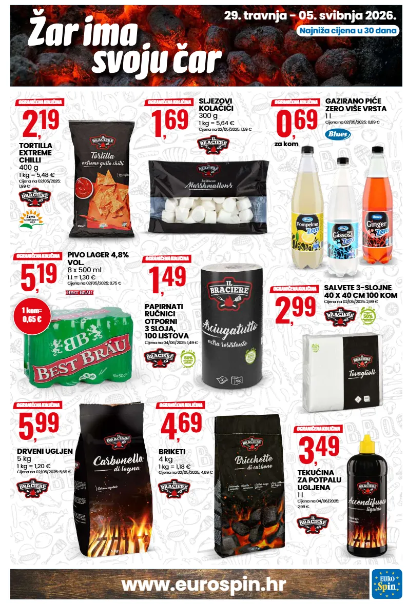 29. travnja - 05. svibnja 2026. www.eurospin.hr najniža cijena u 30 dana 2 , 19 samo ulje suncokretovo ograničena količina tortilla extreme chilli 400 g 1 kg = 5,48 € cijena na 02/05/2025: 1,99 € 1 , 69 ograničena količina sljezovi kolačići 300 g 1 kg = 5,64 € cijena na 02/05/2025: 1,59 € 0 , 69 za kom ograničena količina gazirano piće zero više vrsta 1 l cijena na 02/05/2025: 0,69 € 5 , 19 ograničena količina pivo lager 4,8% vol. 8 x 500 ml 1 l = 1,30 € cijena na 02/05/2025: 0,75 € 1 , 49 50% recycled plastic ograničena količina papirnati ručnici otporni 3 sloja, 100 listova cijena na 04/06/2025: 1,49 € 2 , 99 50% da plastica confezione con riciclata ograničena količina salvete 3-slojne 40 x 40 cm 100 kom cijena na 02/05/2025: 2,99 € 5 , 99 ograničena količina drveni ugljen 5 kg 1 kg = 1,20 € cijena na 02/05/2025: 5,69 € 3 , 49 ograničena količina tekućina za potpalu ugljena 1 l cijena na 04/06/2025: 2,99 € 4 , 69 ograničena količina briketi 4 kg 1 kg = 1,18 € cijena na 02/05/2025: 4,69 € 1 kom= 0,65 €