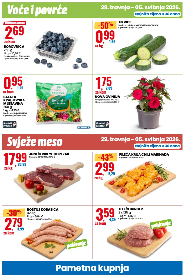 svježe meso voće i povrće 29. travnja - 05. svibnja 2026. 29. travnja - 05. svibnja 2026. pametna kupnja najniža cijena u 30 dana najniža cijena u 30 dana juneći ribeye odrezak cijena na 20/06/2025: 20,49 € 17 , 99 20,99 za kg teleći burger 2 x 125 g 1 kg = 14,36 € cijena na 02/05/2025: 4,39 € pakiranje 3 , 59 4,39 za kom pileća krila chili marinada cijena na 02/05/2025: 5,29 € 2 , 99 5,29 za kg -43 % roštilj kobasica 420 g 1 kg = 6,64 € cijena na 03/04/2026: 4,39 € pakiranje 2 , 79 3,99 za kom -30 % borovnica 250 g 1 kg = 10,76 € zemlja podrijetla: španjolska cijena na 02/05/2025: 2,99 € 2 , 69 za kom ograničena količina tikvice zemlja podrijetla: španjolska/italija/turska cijena na 02/05/2025: 1,59 € 0 , 99 1,99 za kg -50 % salata kraljevska mješavina 200 g 1 kg = 4,75 € zemlja podrijetla: hrvatska cijena na 12/12/2025: 1,99 € 0 , 95 1,25 za kom nova gvineja zemlja podrijetla: hrvatska cijena na 02/05/2025: 1,99 € 1 , 75 2,09 za kom