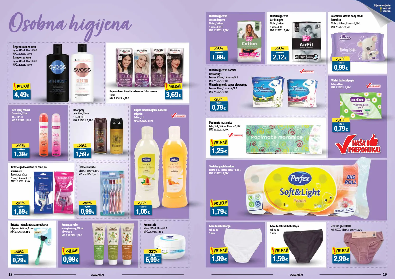 cijene vrijede već od utorka ! 9,00 € 6,99 € -22% 2,69 € 1,99 € -26% 2,89 € 2,12 € -26% 1,59 € 0,99 € -37% 0,99 € 1,79 € 1,39 € -22% 0,59 € 0,29 € -50% 2,09 € 1,59 € -23% 1,99 € 1,59 € -20% 1,49 € 0,99 € -33% 1,25 € 0,99 € 0,79 € -20% krema soft nivea, 200 ml, 1 l = 6,69 € mpc 2.5.2025.: 8,69 € ulošci higijenski cotton super+ violeta, 20 kom 1 kom = 0,09 € mpc 2.5.2025.: 2,79 € ulošci higijenski air fit night violeta, 20 kom 1 kom = 0,11 € mpc 2.5.2025.: 3,09 € maramice vlažne baby med i kamilica violeta, 51 kom, 1 kom = 0,02 € mpc 2.5.2025.: 1,59 € krema za ruke green pharmacy, 100 ml 1 l = 9,90 € mpc 6.12.2025.: 1,10 € deo sprej ženski concertino, 75 ml 1 l = 18,53 € mpc 2.5.2025.: 1,99 € britvica jednokratna za muškarce edgemax, 3 oštrice, 1 kom mpc 2.5.2025.: 0,65 € britvice jednokratne za žene, za muškarce edgemax, 3 oštice 5 kom, 1 kom = 0,32 € mpc 2.5.2025.: 2,30 € deo spray jean marc, 150 ml 1 l = 10,60 € mpc 2.5.2025.: 2,19 € četkice za zube 6 kom, 1 kom = 0,17 € mpc 2.5.2025.: 1,72 € papirnate maramice ceba, 3-sl., 10 kom, 1 kom = 0,13 € mpc 2.5.2025.: 1,59 € ulošci higijenski normal ultrawings femme, 10 kom, 1 kom = 0,08 € mpc 2.5.2025.: 0,99 € ulošci higijenski super ultrawings femme, 9 kom, 1 kom = 0,09 € mpc 2.5.2025.: 0,99 € 4,49 € 3,69 € 1,79 € 1,16 € 0,79 € -31% 1,59 € 1,05 € -33% regenerator za kosu syoss, 440 ml, 1 l = 10,20 € mpc 2.5.2025.: 5,59 € šampon za kosu syoss, 440 ml, 1 l = 10,20 € mpc 2.5.2025.: 5,59 € boje za kosu palette intensive color creme 1 kom mpc 2.5.2025.: 4,99 € toaletni papir breskva perfex, 3-sl., 10 rola, 1 rola = 0,18 € mpc 2.5.2025.: 2,79 € vlažni toaletni papir ceba, 60 kom mpc 2.5.2025.: 1,21 € kupka med i mlijeko, badem i mlijeko bellesa, 1 l mpc 2.5.2025.: 1,59 € 1,99 € 1,59 € 2,99 € gaće ženske marija vel: 42-46 1 kom gaće ženske duboke maja vel: 42-46 1 kom ženske gaće bella vel: m-xxl, 3 kom, 1 kom = 1,00 € osobna higijena 18 www.ntl.hr 19 www.ntl.hr