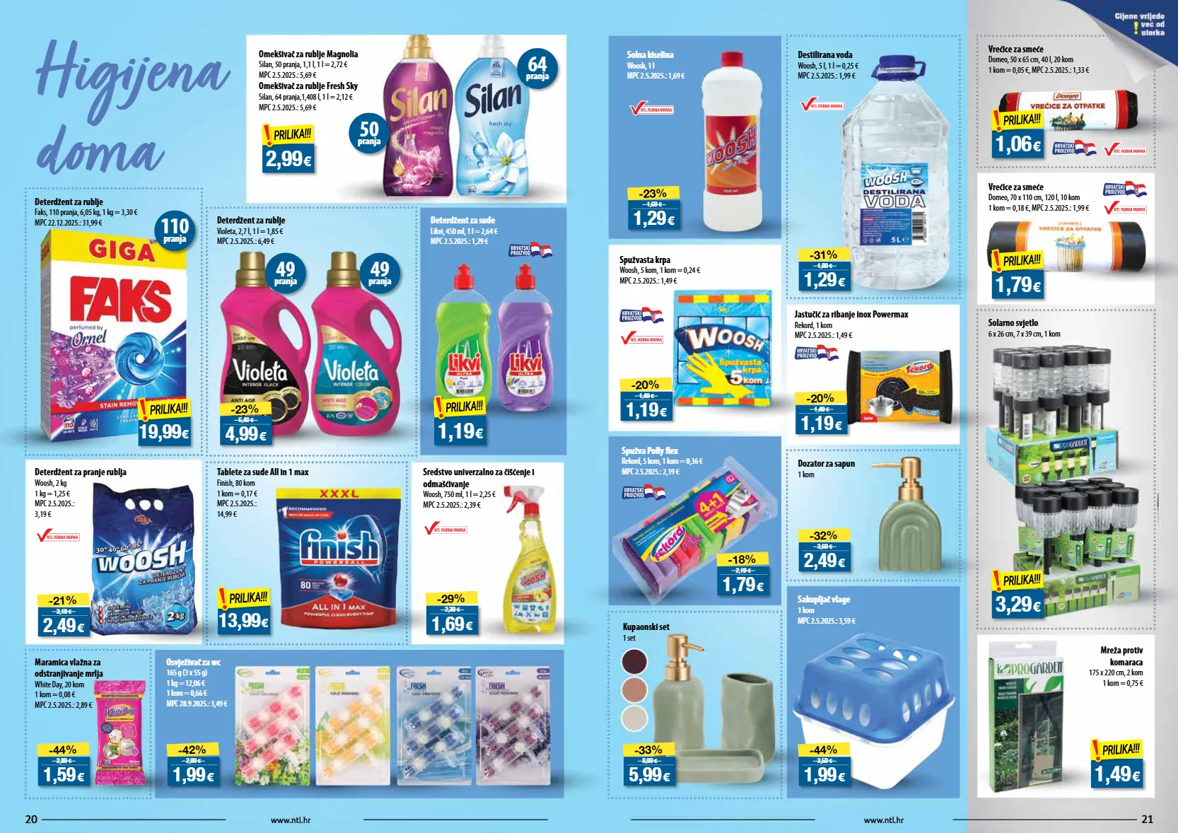 cijene vrijede već od utorka ! 1,19 € 2,99 € 2,89 € 1,59 € -44% 3,59 € 1,99 € -44% 2,99 € 1,99 € -42% 6,49 € 4,99 € -23% 2,39 € 1,69 € -29% 3,19 € 2,49 € -21% 1,69 € 1,29 € -23% 1,89 € 1,29 € -31% 19,99 € 13,99 € deterdžent za suđe likvi, 450 ml, 1 l = 2,64 € mpc 2.5.2025.: 1,29 € omekšivač za rublje magnolia silan, 50 pranja, 1,1 l, 1 l = 2,72 € mpc 2.5.2025.: 5,69 € omekšivač za rublje fresh sky silan, 64 pranja,1,408 l, 1 l = 2,12 € mpc 2.5.2025.: 5,69 € tablete za suđe all in 1 max finish, 80 kom 1 kom = 0,17 € mpc 2.5.2025.: 14,99 € maramica vlažna za odstranjivanje mrlja white day, 20 kom 1 kom = 0,08 € mpc 2.5.2025.: 2,89 € sakupljač vlage 1 kom mpc 2.5.2025.: 3,59 € osvježivač za wc 165 g (3 x 55 g) 1 kg = 12,06 € 1 kom = 0,66 € mpc 28.9.2025.: 3,49 € deterdžent za rublje violeta, 2,7 l, 1 l = 1,85 € mpc 2.5.2025.: 6,49 € sredstvo univerzalno za čišćenje i odmašćivanje woosh, 750 ml, 1 l = 2,25 € mpc 2.5.2025.: 2,39 € deterdžent za pranje rublja woosh, 2 kg 1 kg = 1,25 € mpc 2.5.2025.: 3,19 € solna kiselina woosh, 1 l mpc 2.5.2025.: 1,69 € destilirana voda woosh, 5 l, 1 l = 0,25 € mpc 2.5.2025.: 1,99 € deterdžent za rublje faks, 110 pranja, 6,05 kg, 1 kg = 3,30 € mpc 22.12.2025.: 31,99 € 2,19 € 1,79 € -18% 1,49 € 1,19 € -20% 1,49 € 1,19 € -20% spužva polly flex rekord, 5 kom, 1 kom = 0,36 € mpc 2.5.2025.: 2,19 € jastučić za ribanje inox powermax rekord, 1 kom mpc 2.5.2025.: 1,49 € spužvasta krpa woosh, 5 kom, 1 kom = 0,24 € mpc 2.5.2025.: 1,49 € 8,99 € 5,99 € -33% 3,69 € 2,49 € -32% kupaonski set 1 set dozator za sapun 1 kom 1,06 € 1,79 € 3,29 € 1,49 € vrećice za smeće domeo, 50 x 65 cm, 40 l, 20 kom 1 kom = 0,05 €, mpc 2.5.2025.: 1,33 € vrećice za smeće domeo, 70 x 110 cm, 120 l, 10 kom 1 kom = 0,18 €, mpc 2.5.2025.: 1,99 € solarno svjetlo 6 x 26 cm, 7 x 39 cm, 1 kom mreža protiv komaraca 175 x 220 cm, 2 kom 1 kom = 0,75 € higijena doma 50 pranja 49 pranja 49 pranja 110 pranja 64 pranja 21 www.ntl.hr 20 www.ntl.hr