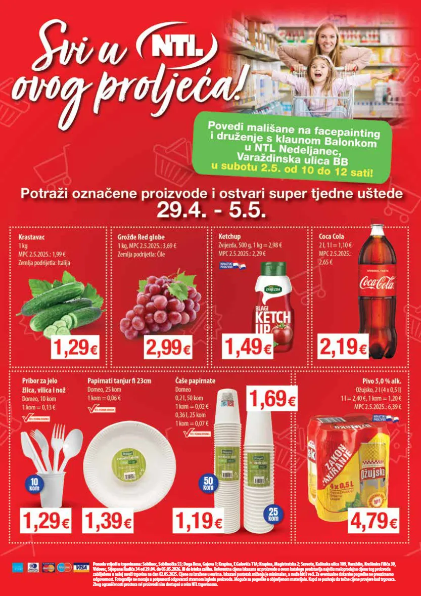potraži označene proizvode i ostvari super tjedne uštede 29.4. - 5.5. povedi mališane na facepainting i druženje s klaunom balonkom u ntl nedeljanec, varaždinska ulica bb u subotu 2.5. od 10 do 12 sati! coca cola 2 l, 1 l = 1,10 € mpc 2.5.2025.: 2,65 € grožđe red globe 1 kg, mpc 2.5.2025.: 3,69 € zemlja podrijetla: čile 2,99 € krastavac 1 kg mpc 2.5.2025.: 1,99 € zemlja podrijetla: italija 1,29 € ketchup zvijezda, 500 g, 1 kg = 2,98 € mpc 2.5.2025.: 2,29 € 1,49 € 2,19 € 50 kom 25 kom 1,19 € pivo 5,0 % alk. ožujsko, 2 l (4 x 0,5 l) 1 l = 2,40 €, 1 kom = 1,20 € mpc 2.5.2025.: 6,39 € 4,79 € 1,39 € papirnati tanjur fi 23cm domeo, 25 kom 1 kom = 0,06 € čaše papirnate domeo 0,2 l, 50 kom 1 kom = 0,02 € 0,36 l, 25 kom 1 kom = 0,07 € pribor za jelo žlica, vilica i nož domeo, 10 kom 1 kom = 0,13 € 1,29 € 10 kom 1,69 € ponuda vrijedi u trgovinama: soblinec, soblinečka 55; duga resa, gajeva 1; krapina, f.galovića 11a; krapina, magistratska 2; sesvete, kašinska ulica 109, varaždin, krešimira filića 39, vidovec, stjepana radića 34 od 29.04. do 05.05.2026. ili do isteka zaliha. referentna cijena iskazana uz proizvode u ovom katalogu predstavlja najvišu maloprodajnu cijenu tog proizvoda zabilježenu u našoj mreži trgovina na dan 02.05.2025. cijene su izražene u eurima. iskazani postotak sniženja je minimalan, a može biti i veći. za eventualne tiskarske pogreške ne preuzimamo odgovornost. fotografije ne moraju u potpunosti odgovarati stvarnom izgledu proizvoda. moguće su pogreške u objavljenom materijalu. kupci se pozivaju da točne cijene provjere kod trgovaca. zbog ograničenosti prostora svi proizvodi nisu dostupni u svim ntl trgovinama.