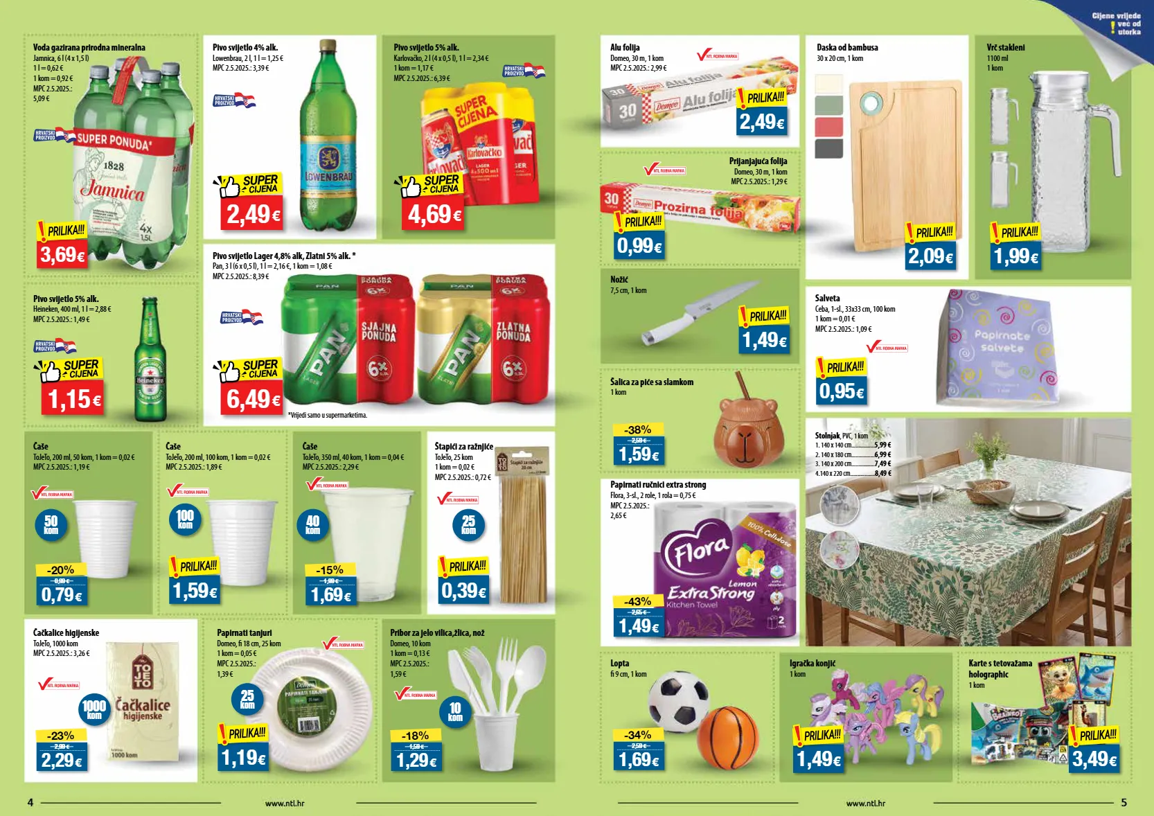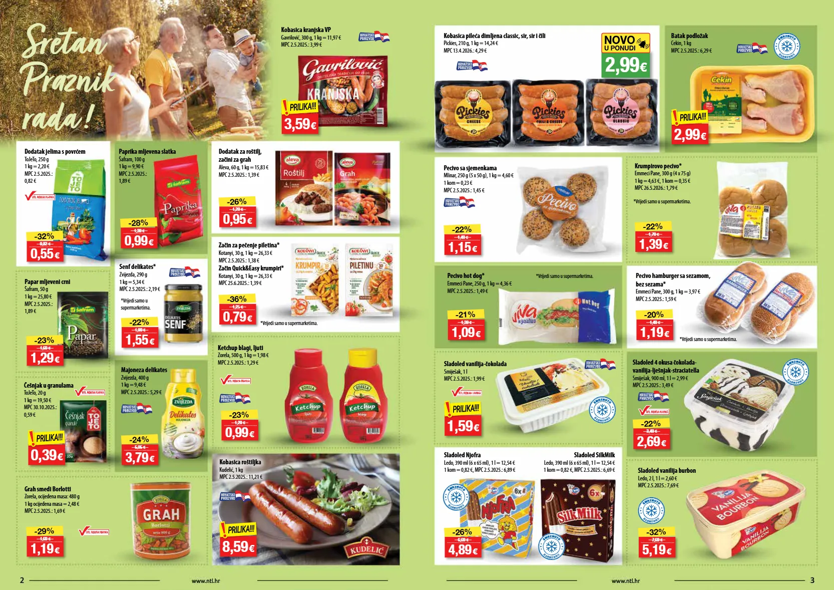1,99 € 1,55 € -22% 1,29 € 0,99 € -23% *vrijedi samo u supermarketima. 1,39 € 0,99 € -28% 1,69 € 1,29 € -23% 0,39 € 1,29 € 0,95 € -26% 1,25 € 0,79 € -36% *vrijedi samo u supermarketima. *vrijedi samo u supermarketima. *vrijedi samo u supermarketima. *vrijedi samo u supermarketima. 0,82 € 0,55 € -32% 5,05 € 3,79 € -24% senf delikates* zvijezda, 290 g 1 kg = 5,34 € mpc 2.5.2025.: 2,19 € ketchup blagi, ljuti zorela, 500 g, 1 kg = 1,98 € mpc 2.5.2025.: 1,29 € paprika mljevena slatka šafram, 100 g 1 kg = 9,90 € mpc 2.5.2025.: 1,89 € papar mljeveni crni šafram, 50 g 1 kg = 25,80 € mpc 2.5.2025.: 1,89 € češnjak u granulama tojeto, 20 g 1 kg = 19,50 € mpc 30.10.2025.: 0,59 € dodatak za roštilj, začini za grah aleva, 60 g, 1 kg = 15,83 € mpc 2.5.2025.: 1,39 € začin za pečenje piletina* kotanyi, 30 g, 1 kg = 26,33 € mpc 2.5.2025.: 1,38 € začin quick&easy krumpiri* kotanyi, 30 g, 1 kg = 26,33 € mpc 25.6.2025.: 1,39 € dodatak jelima s povrćem tojeto, 250 g 1 kg = 2,20 € mpc 2.5.2025.: 0,82 € majoneza delikates zvijezda, 400 g 1 kg = 9,48 € mpc 2.5.2025.: 5,29 € 8,59 € 2,99 € s m r z n u t o s m r z n u t o kobasica roštiljka kudelić, 1 kg mpc 2.5.2025.: 11,21 € batak podložak cekin, 1 kg mpc 2.5.2025.: 6,29 € kobasica pileća dimljena classic, sir, sir i čili pickies, 210 g, 1 kg = 14,24 € mpc 13.4.2026.: 4,29 € 1,69 € 1,19 € -29% grah smeđi borlotti zorela, ocijeđena masa: 480 g 1 kg ocijeđena masa = 2,48 € mpc 2.5.2025.: 1,69 € 1,49 € 1,15 € -22% 1,49 € 1,19 € -20% 1,39 € 1,09 € -21% 1,79 € 1,39 € -22% pecivo sa sjemenkama mlinar, 250 g (5 x 50 g), 1 kg = 4,60 € 1 kom = 0,23 € mpc 2.5.2025.: 1,45 € pecivo hamburger sa sezamom, bez sezama* emmeci pane, 300 g, 1 kg = 3,97 € mpc 2.5.2025.: 1,59 € pecivo hot dog* emmeci pane, 250 g, 1 kg = 4,36 € mpc 2.5.2025.: 1,49 € 6,69 € 4,89 € -26% 7,69 € 5,19 € -32% 1,59 € 3,49 € 2,69 € -22% s m r z n u t o s m r z n u t o s m r z n u t o s m r z n u t o s m r z n u t o s m r z n u t o s m r z n u t o s m r z n u t o s m r z n u t o s m r z n u t o sladoled njofra ledo, 390 ml (6 x 65 ml), 1 l = 12,54 € 1 kom = 0,82 €, mpc 2.5.2025.: 6,89 € sladoled silkmilk ledo, 390 ml (6 x 65 ml), 1 l = 12,54 € 1 kom = 0,82 €, mpc 2.5.2025.: 6,69 € sladoled vanilija burbon ledo, 2 l, 1 l = 2,60 € mpc 2.5.2025.: 7,69 € sladoled vanilija-čokolada smiješak, 1 l mpc 2.5.2025.: 1,99 € sladoled 4 okusa čokolada- vanilija-lješnjak-straciatella smiješak, 900 ml, 1 l = 2,99 € mpc 2.5.2025.: 3,49 € sretan praznik rada ! 2,99 € 3,59 € kobasica kranjska vp gavrilović, 300 g, 1 kg = 11,97 € mpc 2.5.2025.: 3,99 € krumpirovo pecivo* emmeci pane, 300 g (4 x 75 g) 1 kg = 4,63 €, 1 kom = 0,35 € mpc 26.5.2026.: 1,79 € 2 www.ntl.hr 3 www.ntl.hr