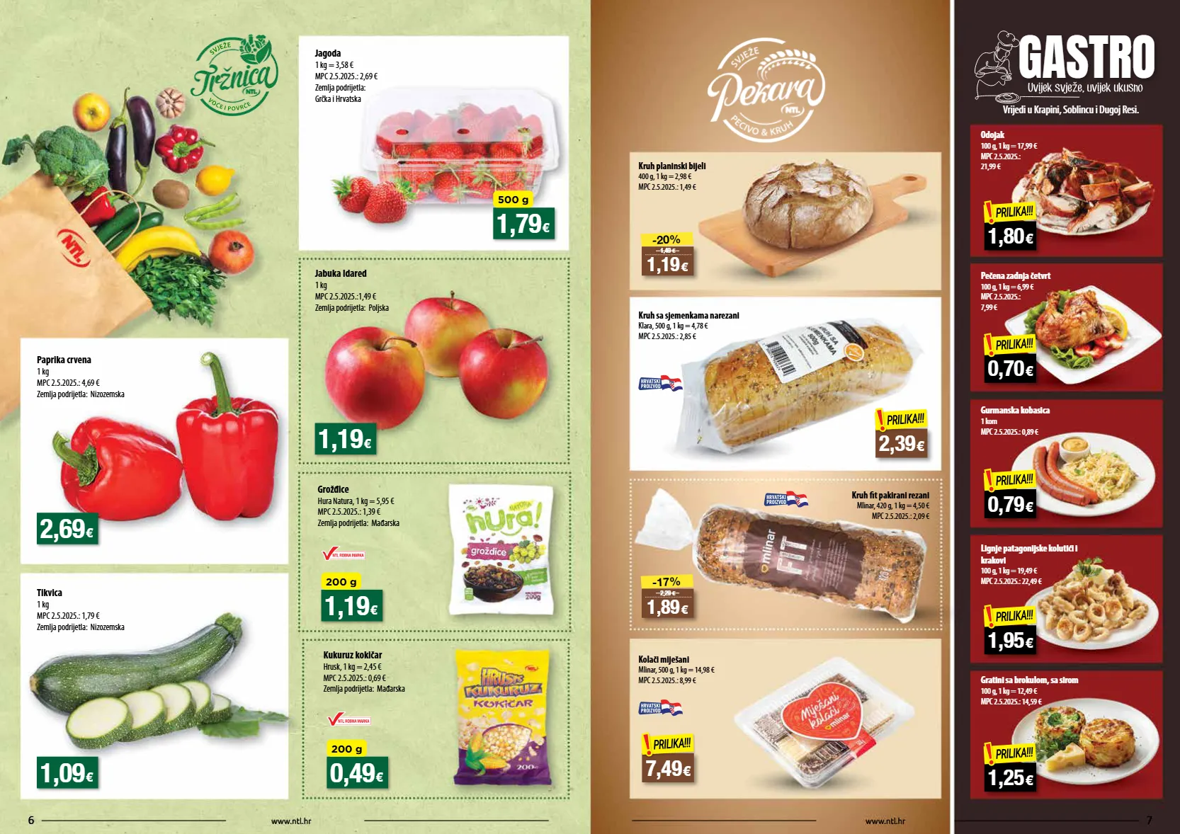 vrijedi u krapini, soblincu i dugoj resi. gastro 2,29 € 1,89 € -17% 7,49 € 1,49 € 1,19 € -20% 2,39 € kruh fit pakirani rezani mlinar, 420 g, 1 kg = 4,50 € mpc 2.5.2025.: 2,09 € kolači miješani mlinar, 500 g, 1 kg = 14,98 € mpc 2.5.2025.: 8,99 € kruh planinski bijeli 400 g, 1 kg = 2,98 € mpc 2.5.2025.: 1,49 € kruh sa sjemenkama narezani klara, 500 g, 1 kg = 4,78 € mpc 2.5.2025.: 2,85 € 0,70 € 1,95 € 1,25 € 0,79 € 1,80 € odojak 100 g, 1 kg = 17,99 € mpc 2.5.2025.: 21,99 € pečena zadnja četvrt 100 g, 1 kg = 6,99 € mpc 2.5.2025.: 7,99 € lignje patagonijske kolutići i krakovi 100 g, 1 kg = 19,49 € mpc 2.5.2025.: 22,49 € gratini sa brokulom, sa sirom 100 g, 1 kg = 12,49 € mpc 2.5.2025.: 14,59 € gurmanska kobasica 1 kom mpc 2.5.2025.: 0,89 € jagoda 1 kg = 3,58 € mpc 2.5.2025.: 2,69 € zemlja podrijetla: grčka i hrvatska grožđice hura natura, 1 kg = 5,95 € mpc 2.5.2025.: 1,39 € zemlja podrijetla: mađarska kukuruz kokičar hrusk, 1 kg = 2,45 € mpc 2.5.2025.: 0,69 € zemlja podrijetla: mađarska jabuka idared 1 kg mpc 2.5.2025.:1,49 € zemlja podrijetla: poljska paprika crvena 1 kg mpc 2.5.2025.: 4,69 € zemlja podrijetla: nizozemska tikvica 1 kg mpc 2.5.2025.: 1,79 € zemlja podrijetla: nizozemska 1,19 € 2,69 € 1,09 € 1,79 € 500 g 1,19 € 200 g 0,49 € 200 g 6 www.ntl.hr 7 www.ntl.hr