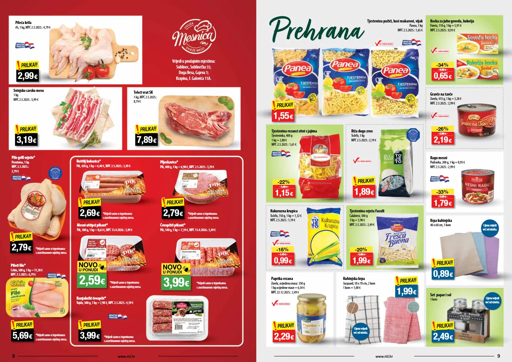 1,49 € 1,15 € -22% 1,55 € 1,89 € 0,99 € 0,65 € -34% 2,29 € 2,99 € 2,19 € -26% 1,19 € 0,99 € -16% 2,49 € 1,99 € -20% tjestenina rezanci sitni s jajima tjesteninka, 400 g 1 kg = 2,88 € mpc 2.5.2025.: 1,61 € tjestenina pužići, kosi makaroni, vijak panea, 1 kg mpc 2.5.2025.: 1,65 € riža dugo zrno tojeto, 1 kg mpc 2.5.2025.: 2,19 € tjestenina svježa fussili calabresi, 500 g 1 kg = 3,98 € mpc 2.5.2025.: 2,49 € kocka za juhu goveđa, kokošja fineta, 110 g, 1 kg = 5,91 € mpc 2.5.2025.: 0,93 € paprika rezana zorela, ocijeđena masa: 350 g 1 kg ocijeđene mase = 6,54 € mpc 22.12.2025.: 2,49 € gravče na tavče zorela, 415 g, 1 kg = 5,28 € mpc 2.5.2025.: 2,99 € kukuruzna krupica tojeto, 750 g, 1 kg = 1,32 € mpc 2.5.2025.: 1,19 € 1,99 € 0,89 € 2,49 € kuhinjska krpa jacquard, 50 x 70 cm, 2 kom 1 kom = 1,00 € krpa kuhinjska 40 x 60 cm, 1 kom set papar i sol 1 kom vrijedi u prodajnim mjestima: soblinec, soblinečka 55; duga resa, gajeva 1; krapina, f. galovića 11a. 2,69 € 1,79 € -33% ragu mesni podravka, 200 g, 1 kg = 8,95 € mpc 2.5.2025.: 2,99 € prehrana cijena vrijedi već od utorka. cijena vrijedi već od utorka. cijena vrijedi već od utorka. 5,69 € 2,99 € 2,79 € *vrijedi samo u trgovinama s asortimanom svježeg mesa. *vrijedi samo u trgovinama s asortimanom svježeg mesa. *vrijedi samo u trgovinama s asortimanom svježeg mesa. *vrijedi samo u trgovinama s asortimanom svježeg mesa. *vrijedi samo u trgovinama s asortimanom svježeg mesa. *vrijedi samo u trgovinama s asortimanom svježeg mesa. *vrijedi samo u trgovinama s asortimanom svježeg mesa. pileći file* cekin, 500 g, 1 kg = 11,38 € mpc 2.5.2025.: 6,79 € pileća krila rfs, 1 kg, mpc 2.5.2025.: 4,79 € pile grill svježe* perutnina, 1 kg mpc 2.5.2025.: 2,79 € 2,69 € 2,79 € 3,99 € 3,19 € 7,89 € roštilj kobasica* pik, 420 g, 1 kg = 6,40 €, mpc 2.5.2025.: 3,49 € pljeskavica* pik, 400 g, 1 kg = 6,98 €, mpc 2.5.2025.: 3,29 € mesni uštipci pikant* pik, 300 g, 1 kg = 8,63 €, mpc 13.4.2026.: 3,49 € čevapčići pikant* pik, 540 g, 1 kg = 7,39 €, mpc 13.4.2026.: 5,49 € banjalučki čevapčić* vajda, 500 g, 1 kg = 7,98 €, mpc 2.5.2025.: 4,59 € svinjsko carsko meso 1 kg mpc 2.5.2025.: 5,99 € teleći vrat sk 1 kg, mpc 2.5.2025.: 8,79 € 2,59 € 3,99 € 8 www.ntl.hr 9 www.ntl.hr
