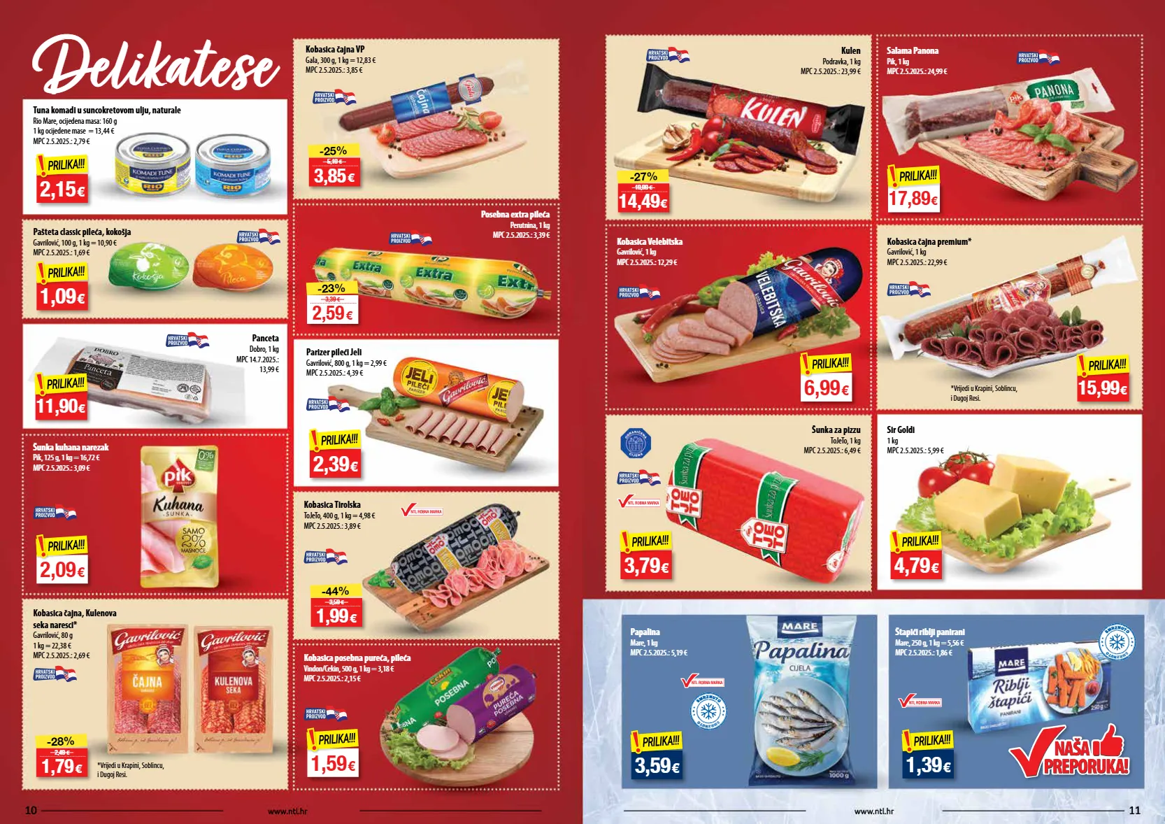 2,15 € 1,09 € 3,39 € 2,59 € -23% 2,09 € 5,19 € 3,85 € -25% 2,49 € 1,79 € -28% *vrijedi u krapini, soblincu, i dugoj resi. 3,59 € 1,99 € -44% 1,59 € 11,90 € tuna komadi u suncokretovom ulju, naturale rio mare, ocijeđena masa: 160 g 1 kg ocijeđene mase = 13,44 € mpc 2.5.2025.: 2,79 € pašteta classic pileća, kokošja gavrilović, 100 g, 1 kg = 10,90 € mpc 2.5.2025.: 1,69 € panceta dobro, 1 kg mpc 14.7.2025.: 13,99 € posebna extra pileća perutnina, 1 kg mpc 2.5.2025.: 3,39 € šunka kuhana narezak pik, 125 g, 1 kg = 16,72 € mpc 2.5.2025.: 3,09 € kobasica čajna vp gala, 300 g, 1 kg = 12,83 € mpc 2.5.2025.: 3,85 € kobasica čajna, kulenova seka naresci* gavrilović, 80 g 1 kg = 22,38 € mpc 2.5.2025.: 2,69 € kobasica tirolska tojeto, 400 g, 1 kg = 4,98 € mpc 2.5.2025.: 3,89 € kobasica posebna pureća, pileća vindon/cekin, 500 g, 1 kg = 3,18 € mpc 2.5.2025.: 2,15 € 6,99 € 2,39 € *vrijedi u krapini, soblincu, i dugoj resi. 3,79 € kobasica velebitska gavrilović, 1 kg mpc 2.5.2025.: 12,29 € 15,99 € parizer pileći jeli gavrilović, 800 g, 1 kg = 2,99 € mpc 2.5.2025.: 4,39 € kobasica čajna premium* gavrilović, 1 kg mpc 2.5.2025.: 22,99 € 17,89 € kulen podravka, 1 kg mpc 2.5.2025.: 23,99 € salama panona pik, 1 kg mpc 2.5.2025.: 24,99 € šunka za pizzu tojeto, 1 kg mpc 2.5.2025.: 6,49 € -27% 19,99 € 14,49 € 4,79 € sir goldi 1 kg mpc 2.5.2025.: 5,99 € delikatese s m r z n u t o s m r z n u t o s m r z n u t o s m r z n u t o 1,39 € 3,59 € štapići riblji panirani mare, 250 g, 1 kg = 5,56 € mpc 2.5.2025.: 1,86 € papalina mare, 1 kg mpc 2.5.2025.: 5,19 € 10 www.ntl.hr 11 www.ntl.hr