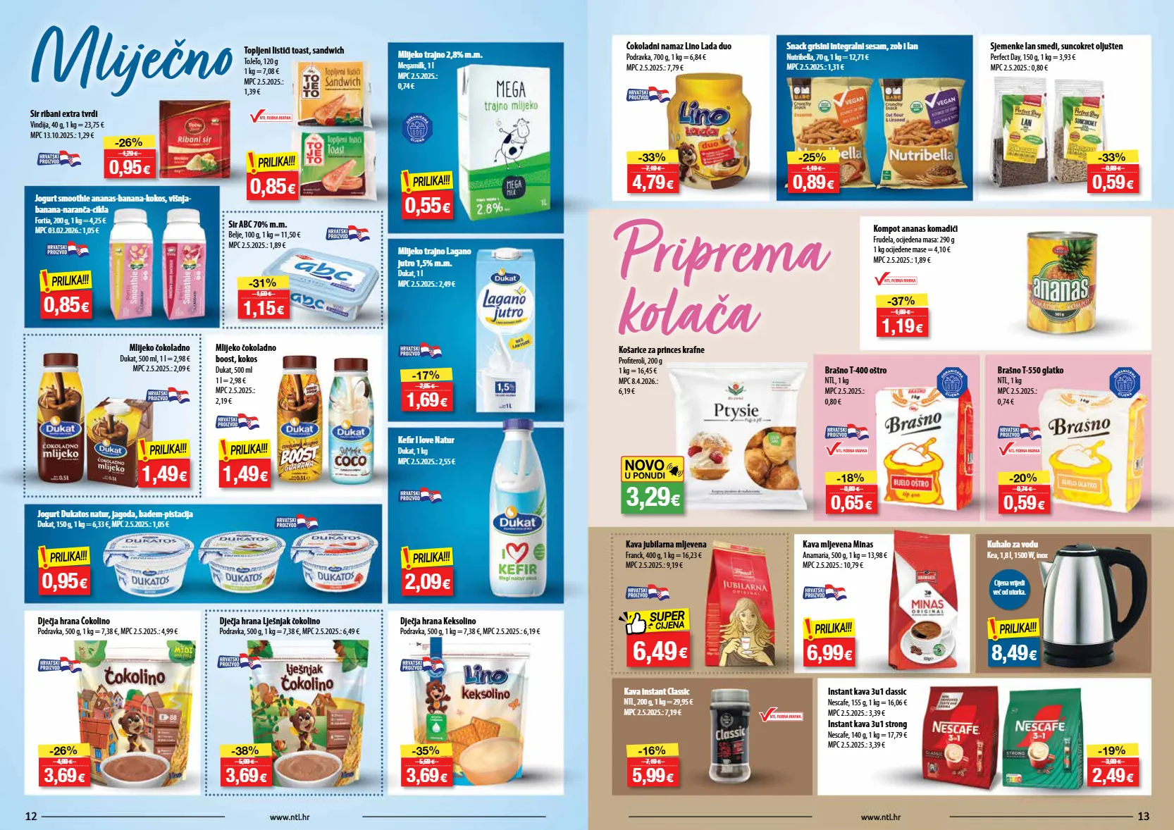 1,69 € 1,15 € -31% 2,05 € 1,69 € -17% 0,95 € 1,49 € 1,49 € 0,55 € 0,85 € sir abc 70% m.m. belje, 100 g, 1 kg = 11,50 € mpc 2.5.2025.: 1,89 € mlijeko trajno lagano jutro 1,5% m.m. dukat, 1 l mpc 2.5.2025.: 2,49 € jogurt dukatos natur, jagoda, badem-pistacija dukat, 150 g, 1 kg = 6,33 €, mpc 2.5.2025.: 1,05 € mlijeko čokoladno dukat, 500 ml, 1 l = 2,98 € mpc 2.5.2025.: 2,09 € mlijeko čokoladno boost, kokos dukat, 500 ml 1 l = 2,98 € mpc 2.5.2025.: 2,19 € mlijeko trajno 2,8% m.m. megamilk, 1 l mpc 2.5.2025.: 0,74 € jogurt smoothie ananas-banana-kokos, višnja- banana-naranča-cikla fortia, 200 g, 1 kg = 4,25 € mpc 03.02.2026.: 1,05 € 7,19 € 4,79 € -33% 4,99 € 3,69 € -26% 5,99 € 3,69 € -38% 5,69 € 3,69 € -35% čokoladni namaz lino lada duo podravka, 700 g, 1 kg = 6,84 € mpc 2.5.2025.: 7,79 € dječja hrana čokolino podravka, 500 g, 1 kg = 7,38 €, mpc 2.5.2025.: 4,99 € dječja hrana lješnjak čokolino podravka, 500 g, 1 kg = 7,38 €, mpc 2.5.2025.: 6,49 € dječja hrana keksolino podravka, 500 g, 1 kg = 7,38 €, mpc 2.5.2025.: 6,19 € 1,19 € 0,89 € -25% 0,89 € 0,59 € -33% snack grisini integralni sesam, zob i lan nutribella, 70 g, 1 kg = 12,71 € mpc 2.5.2025.: 1,31 € sjemenke lan smeđi, suncokret oljušten perfect day, 150 g, 1 kg = 3,93 € mpc 2.5.2025.: 0,80 € 3,29 € 0,80 € 0,65 € -18% 1,89 € 1,19 € -37% 0,74 € 0,59 € -20% brašno t-400 oštro ntl, 1 kg mpc 2.5.2025.: 0,80 € košarice za princes krafne profiteroli, 200 g 1 kg = 16,45 € mpc 8.4.2026.: 6,19 € kompot ananas komadići frudela, ocijeđena masa: 290 g 1 kg ocijeđene mase = 4,10 € mpc 2.5.2025.: 1,89 € brašno t-550 glatko ntl, 1 kg mpc 2.5.2025.: 0,74 € 7,19 € 5,99 € -16% 6,49 € 6,99 € 3,09 € 2,49 € -19% kava instant classic ntl, 200 g, 1 kg = 29,95 € mpc 2.5.2025.: 7,19 € kava jubilarna mljevena franck, 400 g, 1 kg = 16,23 € mpc 2.5.2025.: 9,19 € kava mljevena minas anamaria, 500 g, 1 kg = 13,98 € mpc 2.5.2025.: 10,79 € instant kava 3u1 classic nescafe, 155 g, 1 kg = 16,06 € mpc 2.5.2025.: 3,39 € instant kava 3u1 strong nescafe, 140 g, 1 kg = 17,79 € mpc 2.5.2025.: 3,39 € 8,49 € kuhalo za vodu kea, 1,8 l, 1500 w, inox mliječno priprema kolača cijena vrijedi već od utorka. 2,09 € kefir i love natur dukat, 1 kg mpc 2.5.2025.: 2,55 € sir ribani extra tvrdi vindija, 40 g, 1 kg = 23,75 € mpc 13.10.2025.: 1,29 € 0,85 € topljeni listići toast, sandwich tojeto, 120 g 1 kg = 7,08 € mpc 2.5.2025.: 1,39 € 1,29 € 0,95 € -26% 12 www.ntl.hr 13 www.ntl.hr