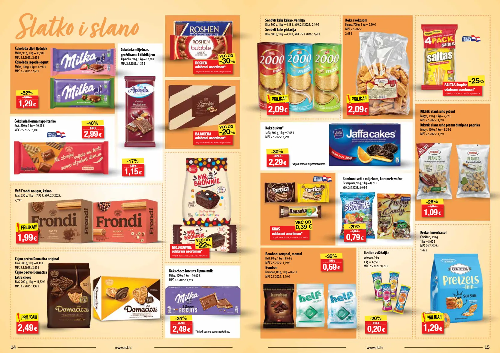 4,99 € 2,99 € -40% 2,49 € 1,99 € 2,69 € 1,29 € -52% 1,39 € 1,15 € -17% 2,09 € 1,09 € 0,69 € -36% 0,25 € 0,20 € -20% 0,99 € 0,79 € -20% 2,09 € čokolada dorina napolitanke kraš, 290 g, 1 kg = 10,31 € mpc 2.5.2025.: 5,69 € vafl frondi nougat, kakao kraš, 250 g, 1 kg = 7,96 €, mpc 2.5.2025.: 2,99 € čajno pecivo domaćica original kraš, 300 g, 1 kg = 8,30 € mpc 2.5.2025.: 3,49 € čajno pecivo domaćica extra choco kraš, 200 g, 1 kg = 11,32 € mpc 2.5.2025.: 3,99 € čokolada cijeli lješnjak milka, 95 g, 1 kg = 13,58 € mpc 2.5.2025.: 2,69 € čokolada jagoda-jogurt milka, 100 g, 1 kg = 12,90 € mpc 2.5.2025.: 2,69 € čokolada mliječna s grožđicama i kikirikijem alpinella, 90 g, 1 kg = 12,78 € mpc 2.5.2025.: 1,39 € keks s kokosom figaro, 700 g, 1 kg = 2,99 € mpc 2.5.2025.: 2,63 € bomboni original, mentol helf, 80 g, 1 kg = 8,63 € mpc 2.5.2025.: 1,19 € bombon kavabon, 80 g, 1 kg = 8,63 € mpc 2.5.2025.: 1,19 € bajadera odabrani asortiman* -20 % već od roshen odabrani asortiman* -30 % već od mr.brownie odabrani asortiman* -22 % već od lizalica zviždaljka solopop, 16 g 1 kg = 12,50 € mpc 2.5.2025.: 0,28 € bombon tvrdi s mlijekom, karamele voćne beyazpinar, 90 g, 1 kg = 8,78 € mpc 2.5.2025.: 0,98 € sendvič keks kakao, vanilija bifa, 500 g, 1 kg = 4,18 €, mpc 2.5.2025.: 2,19 € sendvič keks pistacija bifa, 500 g, 1 kg = 4,18 €, mpc 25.2.2026.: 2,69 € 3,29 € 2,29 € -30% 3,79 € 2,49 € -34% *vrijedi samo u supermarketima. *vrijedi samo u supermarketima. keks biskvit* jaffa, 300 g, 1 kg = 7,63 € mpc 2.5.2025.: 3,29 € keks choco biscuits alpine milk milka, 150 g, 1 kg = 16,60 € mpc 2.5.2025.: 3,79 € 1,29 € 1,49 € 1,09 € -26% krekeri morska sol crackfers, 150 g 1 kg = 8,60 € mpc 24.7.2026.: 1,49 € kikiriki slani suho prženi mogyi, 150 g, 1 kg = 7,27 € mpc 2.5.2025.: 1,59 € kikiriki slani suho prženi dimljena paprika mogyi, 130 g, 1 kg = 8,38 € mpc 2.5.2025.: 1,59 € saltas štapiće odabrani asortiman* -25 % slatko i slano kraš odabrani asortiman* 0,39 € već od 14 www.ntl.hr 15 www.ntl.hr