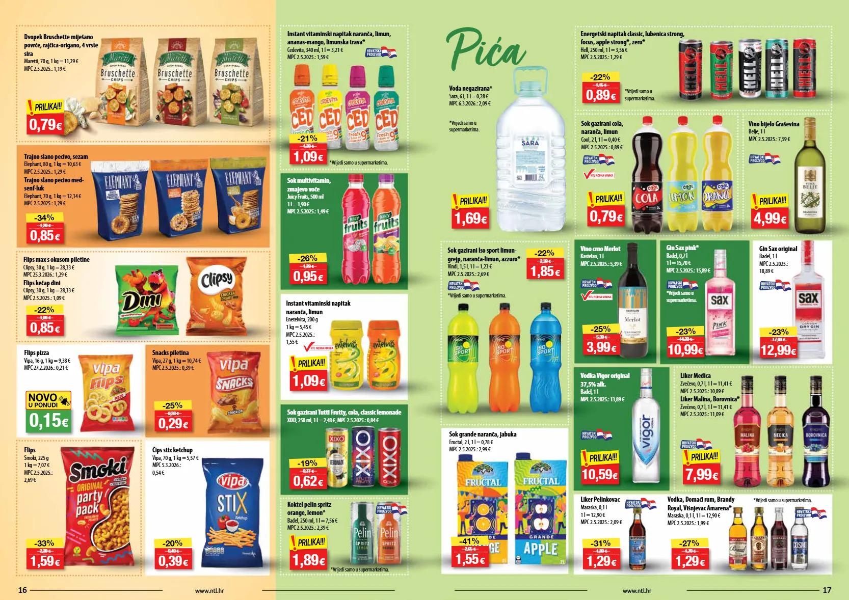 0,79 € 1,29 € 0,85 € -34% dvopek bruschette miješano povrće, rajčica-origano, 4 vrste sira maretti, 70 g, 1 kg = 11,29 € mpc 2.5.2025.: 1,19 € trajno slano pecivo, sezam elephant, 80 g, 1 kg = 10,63 € mpc 2.5.2025.: 1,29 € trajno slano pecivo med- senf-luk elephant, 70 g, 1 kg = 12,14 € mpc 2.5.2025.: 1,29 € 1,69 € 1,29 € 0,95 € -26% 2,65 € 1,55 € -41% 0,77 € 0,62 € -19% 1,09 € *vrijedi samo u supermarketima. *vrijedi samo u supermarketima. *vrijedi samo u supermarketima. *vrijedi samo u supermarketima. 1,39 € 1,09 € -21% 2,39 € 1,85 € -22% 1,15 € 0,89 € -22% voda negazirana * sara, 6 l, 1 l = 0,28 € mpc 6.3.2026.: 2,09 € sok multivitamin, zmajevo voće juicy fruits, 500 ml 1 l = 1,90 € mpc 2.5.2025.: 1,49 € sok grande naranča, jabuka fructal, 2 l, 1 l = 0,78 € mpc 2.5.2025.: 2,99 € sok gazirani tutti frutty, cola, classic lemonade xixo, 250 ml, 1 l = 2,48 €, mpc 2.5.2025.: 0,84 € instant vitaminski napitak naranča, limun enetelvita, 200 g 1 kg = 5,45 € mpc 2.5.2025.: 1,55 € instant vitaminski napitak naranča, limun, ananas-mango, limunska trava* cedevita, 340 ml, 1 l = 3,21 € mpc 2.5.2025.: 1,59 € sok gazirani iso sport limun- grejp, naranča-limun, azzuro* vindi, 1,5 l, 1 l = 1,23 € mpc 2.5.2025.: 2,69 € energetski napitak classic, lubenica strong, focus, apple strong*, zero* hell, 250 ml, 1 l = 3,56 € mpc 2.5.2025.: 1,29 € 4,99 € 5,39 € 3,99 € -25% 1,89 € *vrijedi samo u supermarketima. *vrijedi samo u supermarketima. -23% 17,09 € 12,99 € -23% 14,39 € 10,99 € vino bijelo graševina belje, 1 l mpc 2.5.2025.: 7,59 € vino crno merlot kastelan, 1 l mpc 2.5.2025.: 5,39 € gin sax original badel, 1 l mpc 2.5.2025.: 18,89 € gin sax pink* badel, 0,7 l 1 l = 15,70 € mpc 2.5.2025.: 15,89 € koktel pelin spritz orange, lemon* badel, 250 ml, 1 l = 7,56 € mpc 2.5.2025.: 2,39 € 0,49 € 0,39 € -20% 0,39 € 0,29 € -25% 2,39 € 1,59 € -33% 1,09 € 0,85 € -22% flips pizza vipa, 16 g, 1 kg = 9,38 € mpc 27.2.2026.: 0,21 € čips stix ketchup vipa, 70 g, 1 kg = 5,57 € mpc 5.3.2026.: 0,54 € snacks piletina vipa, 27 g, 1 kg = 10,74 € mpc 2.5.2025.: 0,39 € flips smoki, 225 g 1 kg = 7,07 € mpc 2.5.2025.: 2,69 € flips max s okusom piletine clipsy, 30 g, 1 kg = 28,33 € mpc 25.3.2026.: 1,29 € flips kečap dini clipsy, 30 g, 1 kg = 28,33 € mpc 2.5.2025.: 1,09 € 1,79 € 1,29 € -27% 1,89 € 1,29 € -31% 7,99 € *vrijedi samo u supermarketima. 10,59 € vodka, domaći rum, brandy royal, višnjevac amarena* maraska, 0,1 l, 1 l = 12,90 € mpc 2.5.2025.: 1,99 € liker pelinkovac maraska, 0,1 l 1 l = 12,90 € mpc 2.5.2025.: 2,09 € vodka vigor original 37,5% alk. badel, 1 l mpc 2.5.2025.: 13,89 € liker medica zvečevo, 0,7 l, 1 l = 11,41 € mpc 2.5.2025.: 10,89 € liker malina, borovnica* zvečevo, 0,7 l, 1 l = 11,41 € mpc 2.5.2025.: 11,09 € pića 0,15 € 0,79 € sok gazirani cola, naranča, limun cool, 2 l, 1 l = 0,40 € mpc 2.5.2025.: 0,89 € 16 www.ntl.hr 17 www.ntl.hr