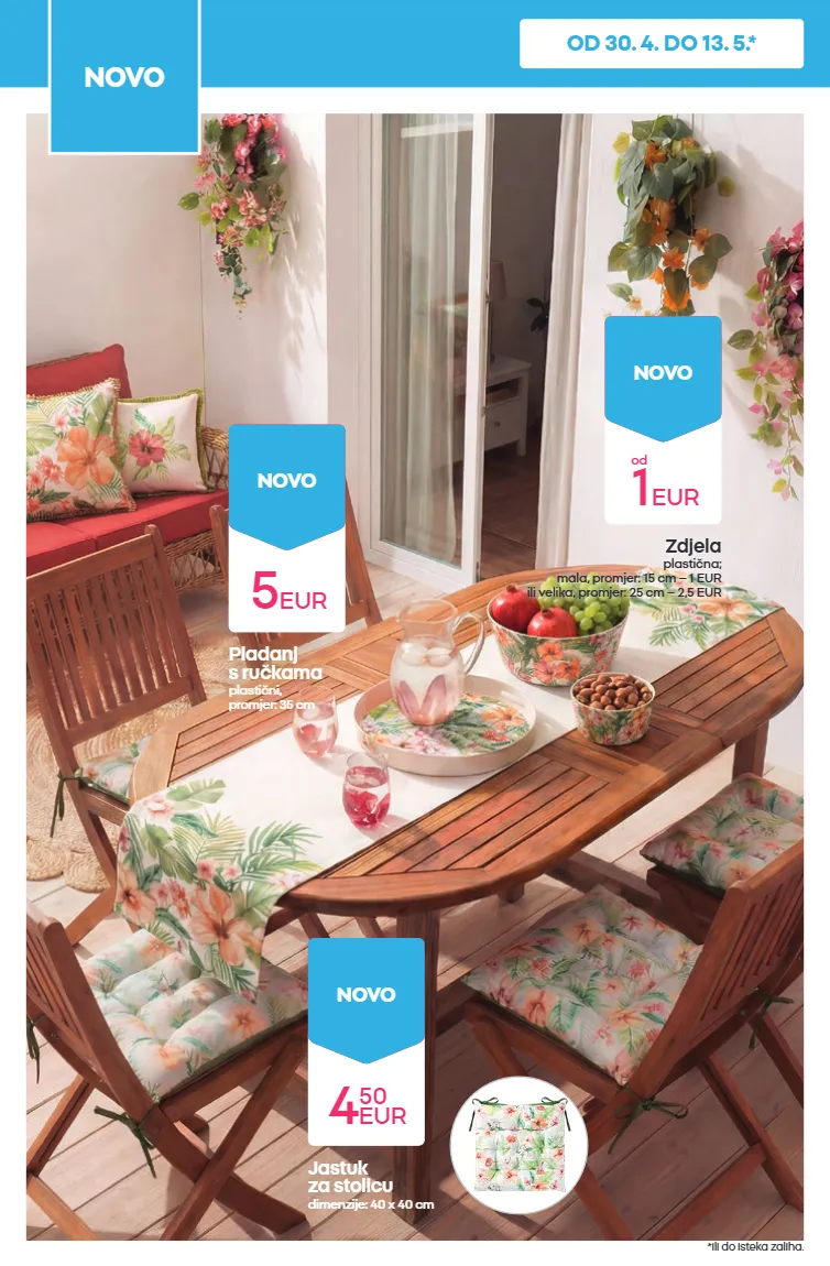 zdjela plastična; mala, promjer: 15 cm – 1 eur ili velika, promjer: 25 cm – 2,5 eur pladanj s ručkama plastični, promjer: 35 cm jastuk za stolicu dimenzije: 40 x 40 cm od 1 eur novo 5 eur novo 4 50 eur novo novo *ili do isteka zaliha. od 30. 4. do 13. 5.*
