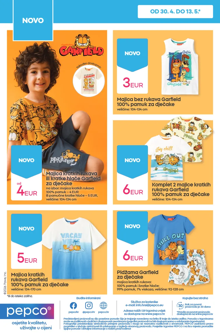 budite informirani adrese naših 139 trgovina uvijek su dostupne na www.pepco.hr služba za korisnike e-mail: info.hrsi@pepco.eu kupujte bez straha *pravila za povrat proizvoda dostupna su na www.pepco.hr rok za povrat proizvoda je 30 dana pepcohr pepco.hr @pepcohr predstavljeni proizvodi su dio posebne ponude čije je trajanje navedeno na letku ili traje do isteka zaliha. ponuda u trgovinama može se razlikovati u količini i dostupnosti asortimana (pojedini proizvodi će biti dostupni samo u odabranim trgovinama). fotografije predstavljaju simbolične primjere proizvoda i mogu se neznatno razlikovati u stvarnosti. pepco zadržava pravo pogreške u slučaju netočnosti ili odstupanja u izgledu stvarnog proizvoda. posjetite trgovine pepco i na licu mjesta pronađite sjajne ponude i detaljne informacije o našim proizvodima! osjetite kvalitetu, uživajte u cijeni majica bez rukava garfield 100% pamuk za dječake veličine: 104-134 cm pidžama garfield za dječake majica kratkih rukava: 100% pamuk i kratke hlače: 99% pamuk, 1% viskoza, veličine: 92-128 cm majica kratkih rukava garfield 100% pamuk za dječake veličine: 134-170 cm majica kratkih rukava ili kratke hlače garfield za dječake na izbor: majica kratkih rukava 100% pamuk – 4 eur ili pamučne kratke hlače – 5 eur, veličine: 104-134 cm komplet 2 majice kratkih rukava garfield 100% pamuk za dječake veličine: 104-134 cm 3 eur novo 6 eur novo 5 eur novo od 4 eur novo 6 eur novo t a k o đ e r d o s t u p n o : novo *ili do isteka zaliha. od 30. 4. do 13. 5.* ©2026 paws, inc.