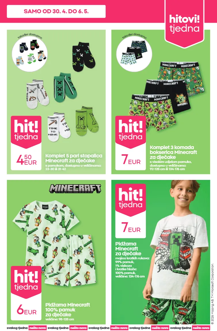 komplet 3 komada bokserica minecraft za dječake s visokim udjelom pamuka, dostupno u veličinama: 92-128 cm ili 134-176 cm komplet 5 pari stopalica minecraft za dječake s pamukom, dostupno u veličinama: 23-30 ili 31-42 pidžama minecraft za dječake majica kratkih rukava: 99% pamuk, 1% viskoza i kratke hlače: 100% pamuk, veličine: 134-176 cm pidžama minecraft 100% pamuk za dječake veličine: 98-128 cm 7 eur hit! tjedna 4 50 eur hit! tjedna 7 eur hit! tjedna 6 eur hit! tjedna t a k o đ e r d o s t u p n o : t a k o đ e r d o s t u p n o : nešto novo svakog tjedna nešto novo svakog tjedna nešto novo svakog tjedna nešto novo svakog tjedna nešto novo svakog tjedna hitovi! tjedna samo od 30. 4. do 6. 5. © 2026 mojang ab. tm microsoft corporation.