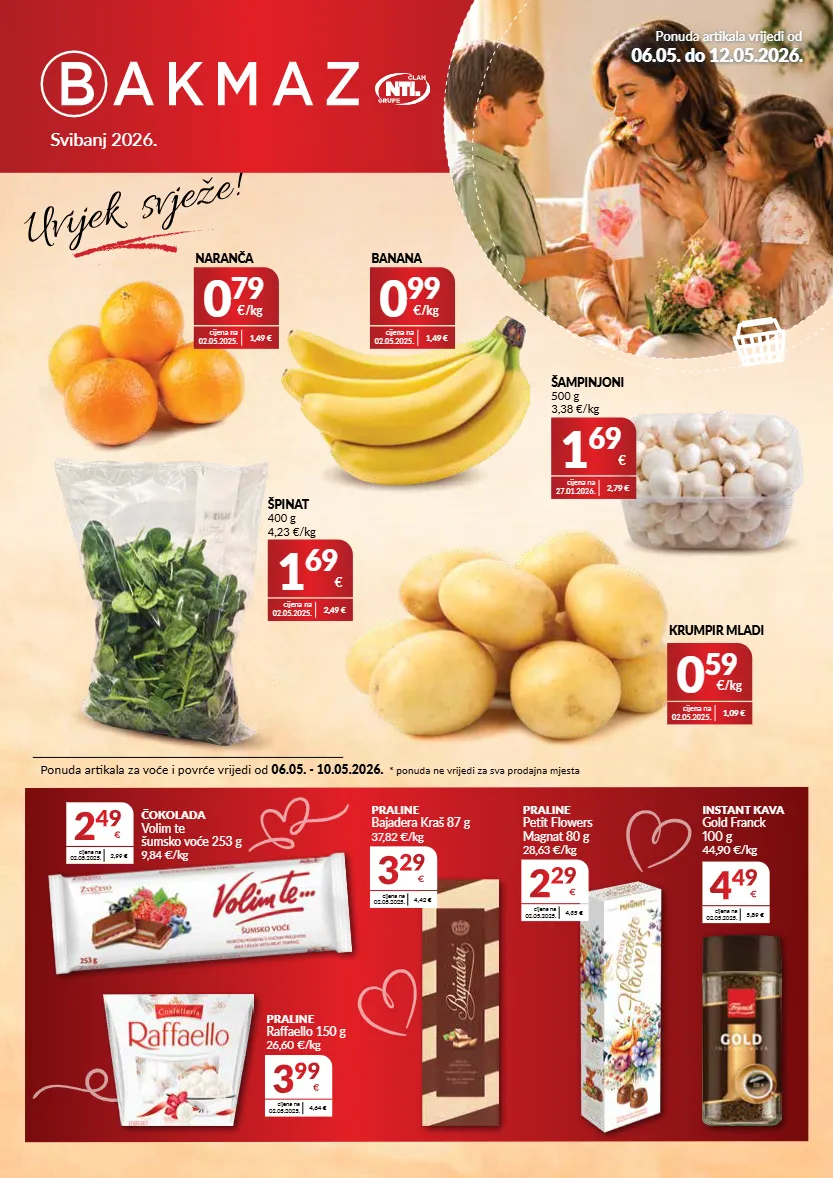 svibanj 2026. ponuda artikala vrijedi od 06.05. do 12.05.2026. ponuda artikala za voće i povrće vrijedi od 06.05. - 10.05.2026. * ponuda ne vrijedi za sva prodajna mjesta špinat 400 g 4,23 €/kg 1 69 € cijena na 02.05.2025. 2,49 € krumpir mladi 0 59 €/kg cijena na 02.05.2025. 1,09 € instant kava gold franck 100 g 44,90 €/kg 4 49 € cijena na 02.05.2025. 5,89 € čokolada volim te šumsko voće 253 g 9,84 €/kg 2 49 € cijena na 02.05.2025. 2,99 € praline petit flowers magnat 80 g 28,63 €/kg 2 29 € cijena na 02.05.2025. 4,35 € praline raffaello 150 g 26,60 €/kg 3 99 € cijena na 02.05.2025. 4,64 € praline bajadera kraš 87 g 37,82 €/kg 3 29 € cijena na 02.05.2025. 4,42 € banana 0 99 €/kg cijena na 02.05.2025. 1,49 € naranča 0 79 €/kg cijena na 02.05.2025. 1,49 € šampinjoni 500 g 3,38 €/kg 1 69 € cijena na 27.01.2026. 2,79 €