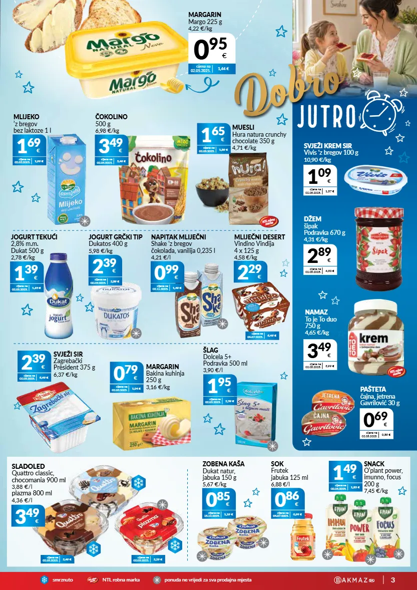 3 smrznutontl r o b n a m a r k a p o n u d a n e v r i j e d i z a s v a p r o d a j n a m j e s t a ntl robna marka dobro jutro 1 69 € cijena na 02.05.2025. 1,99 € mlijeko ’z bregov bez laktoze 1 l 2 39 € cijena na 02.05.2025. 2,89 € jogurt grčki tip dukatos 400 g 5,98 €/kg 1 39 € cijena na 02.05.2025. 1,65 € jogurt tekući 2,8% m.m. dukat 500 g 2,78 €/kg cijena na 15.12.2025. 1,19 € 0 85 € zobena kaša dukat natur, jabuka 150 g 5,67 €/kg šlag dolcela 5+ podravka 500 ml 3,90 €/l 1 95 € cijena na 02.05.2025. 2,59 € cijena na 02.05.2025. 3,49 € 2 39 € svježi sir zagrebački prèsident 375 g 6,37 €/kg cijena na 02.05.2025. 1,04 € 0 79 € margarin bakina kuhinja 250 g 3,16 €/kg 3 49 € cijena na 02.05.2025. 3,99 € namaz to je to duo 750 g 4,65 €/kg 0 69 € cijena na 02.05.2025. 0,89 € pašteta čajna, jetrena gavrilović 30 g 1 09 € cijena na 02.05.2025. 1,57 € svježi krem sir vivis ‘z bregov 100 g 10,90 €/kg 2 89 € cijena na 02.05.2025. 4,30 € džem šipak podravka 670 g 4,31 €/kg cijena na 02.11.2025. 1,49 € 0 99 € napitak mliječni shake ‘z bregov čokolada, vanilija 0,235 l 4,21 €/l 2 29 € cijena na 04.07.2025. 3,49 € mliječni desert vindino vindija 4 x 125 g 4,58 €/kg 0 86 € cijena na 04.07.2025. 0,99 € sok frutek jabuka 125 ml 6,88 €/l 3 49 € cijena na 02.05.2025. 5,49 € čokolino 500 g 6,98 €/kg 1 49 € cijena na 02.05.2025. 1,85 € snack o’plant power, imunno, focus 200 g 7,45 €/kg ntl robna marka cijena na 02.05.2025. 1,44 € margarin margo 225 g 4,22 €/kg 0 95 € 1 65 € cijena na 02.05.2025. 1,89 € muesli hura natura crunchy chocolate 350 g 4,71 €/kg ntl robna marka cijena na 02.05.2025. 5,49 € cijena na 02.05.2025. 5,29 € 3 49 € sladoled quattro classic, chocomania 900 ml 3,88 €/l plazma 800 ml 4,36 €/l