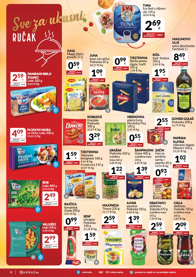 4 smrznutontl r o b n a m a r k a p o n u d a n e v r i j e d i z a s v a p r o d a j n a m j e s t a ntl robna marka sve za ukusni ručak tuna eva fileti u biljnom ulju 100 g 26,90 €/kg 2 69 € cijena na 02.05.2025. 3,99 € 8 49 € cijena na 02.05.2025. 14,49 € maslinovo ulje extra djevičansko farchioni 1 l 0 99 € cijena na 02.05.2025. 1,85 € tjestenina barilla penne rigate, fusilli 500 g 1,98 €/kg 0 59 € cijena na 02.05.2025. 0,75 € juha maggi pileća, goveđa 37 g 1 09 € cijena na 02.05.2025. 1,69 € juha krem od rajčice podravka 60 g 18,17 €/kg 1 95 € cijena na 02.05.2025. 2,59 € riža sant’ andrea 500 g 3,90 €/kg 3 29 € cijena na 02.05.2025. 4,39 € kobasice kranjske podravka 300 g 10,97 €/kg 0 55 € cijena na 02.05.2025. 0,49 € hrenovka pileća extra perutnina ptuj 100 g 5,50 €/kg 1 22 € cijena na 02.05.2025. 1,64 € grašak podravka 420 g ocijeđena masa 260 g 4,69 €/kg 1 39 € cijena na 02.05.2025. 1,55 € šampinjoni giana 400 g ocijeđena masa 200 g 6,95 €/kg 0 93 € cijena na 02.05.2025. 1,95 € začin fant za punjenu sarmu i papriku 60 g 15,50 €/kg 1 02 € cijena na 02.05.2025. 1,69 € paprika slatka mljevena vegeta maestro 100 g 10,20 €/kg 1 59 € cijena na 02.05.2025. 2,80 € tjestenina talianetta bolognese 160 g 9,94 €/kg 4 vrste sira 145 g 10,97 €/kg 2 55 € cijena na 02.05.2025. 3,54 € goveđi gulaš podravka 200 g 12,75 €/kg 0 99 € cijena na 02.05.2025. 1,49 € rajčica koncentrat zorela 200 g 4,95 €/kg 2 59 € cijena na 02.05.2025. 3,59 € krastavci delikates zvijezda 670 g ocijeđena masa 350 g 7,40 €/kg 2 09 € cijena na 02.05.2025. 2,92 € cikla delikates zvijezda 720 g ocijeđena masa 360 g 5,81 €/kg 1 59 € cijena na 02.05.2025. 1,90 € senf estragon podravka 140 g 11,36 €/kg 2 59 € cijena na 02.05.2025. 3,35 € majoneza thomy 220 g 11,77 €/kg 1 39 € cijena na 02.05.2025. 2,89 € ajvar squeeze podravka 310 g 4,48 €/kg 2 49 € cijena na 02.05.2025. 3,19 € bob ledo 400 g 6,23 €/kg cijena na 02.05.2025. 3,49 € 2 59 € panirani riblji štapići ledo 300 g 8,63 €/kg cijena na 02.05.2025. 5,49 € 4 09 € plodovi mora za rižoto ledo 300 g 13,63 €/kg 2 99 € cijena na 02.05.2025. 3,35 € valjušci ledo 500 g 5,98 €/kg ntl robna marka