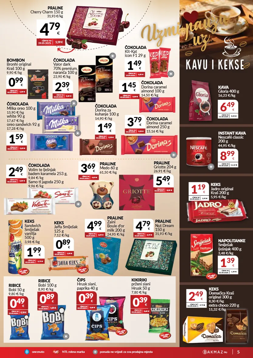 5 smrznutontl r o b n a m a r k a p o n u d a n e v r i j e d i z a s v a p r o d a j n a m j e s t a ntl robna marka praline cherry charm 150 g 31,93 €/kg 4 79 € cijena na 29.05.2025. 5,59 € 1 39 € cijena na 02.05.2025. 1,59 € napolitanke smiješak lješnjak 400 g 3,48 €/kg 6 49 € cijena na 02.05.2025. 8,39 € kava gloria 400 g 16,23 €/kg 8 99 € cijena na 02.05.2025. 11,19 € instant kava nescafé classic 200 g 44,95 €/kg cijena na 02.05.2025. 1,39 € 0 99 € bombon bronhi original kraš 100 g 9,90 €/kg cijena na 02.05.2025. 2,09 € 1 45 € čokolada dorina caramel almond 100 g 14,50 €/kg 1 49 € cijena na 16.04.2026. 1,85 € čokolada kit-kat icon f1 29 g 1 59 € cijena na 02.05.2025. 2,65 € čokolada milka oreo 100 g 15,90 €/kg white 90 g 17,67 €/kg oreo sandwich 92 g 17,28 €/kg 2 39 € cijena na 02.05.2025. 3,49 € čokolada valor dark 70% premium, naranča 100 g 23,90 €/kg 3 69 € cijena na 24.02.2026. 4,95 € praline medo 60 g 61,50 €/kg 5 49 € cijena na 02.05.2025. 8,29 € praline griotte 204 g 26,91 €/kg 4 79 € cijena na 22.09.2025. 6,79 € praline nut dream 150 g 31,93 €/kg 1 99 € cijena na 02.05.2025. 2,75 € keks sandwich smiješak vanilija 500 g 3,98 €/kg 4 99 € cijena na 10.04.2026. 6,99 € praline zaini boule d’or milk 200 g 24,95 €/kg 0 89 € cijena na 02.05.2025. 1,05 € keks jaffa smiješak 125 g 7,12 €/kg 3 79 € cijena na 02.05.2025. 5,59 € čokolada dorina caramel almond 250 g 15,16 €/kg 2 49 € cijena na 02.05.2025. 2,99 € čokolada volim te lješnjak badem karamela 253 g, 9,84 €/kg samo ti jagoda 250 g 9,96 €/kg ntl robna marka ntl robna marka ntl robna marka ntl robna marka ntl robna marka 2 49 € cijena na 02.05.2025. 3,75 € keks domaćica kraš original 300 g 8,30 €/kg extra choco 220 g 11,32 €/kg 1 19 € cijena na 02.05.2025. 1,90 € keks jadro original kraš 200 g 5,95 €/kg kavu i kekse uzmi pauzu uz cijena na 02.05.2025. 2,20 € 1 49 € čokolada dorina za kuhanje 100 g 14,90 €/kg 0 39 € cijena na 02.05.2025. 0,69 € kikiriki prženi slani hrusk 50 g 7,80 €/kg 0 39 € cijena na 02.05.2025. 0,69 € čips hrusk slani, paprika 40 g 0 49 € cijena na 02.05.2025. 0,58 € ribice bobi 50 g 9,80 €/kg 0 89 € cijena na 02.05.2025. 1,05 € ribice bobi 100 g 8,90 €/kg