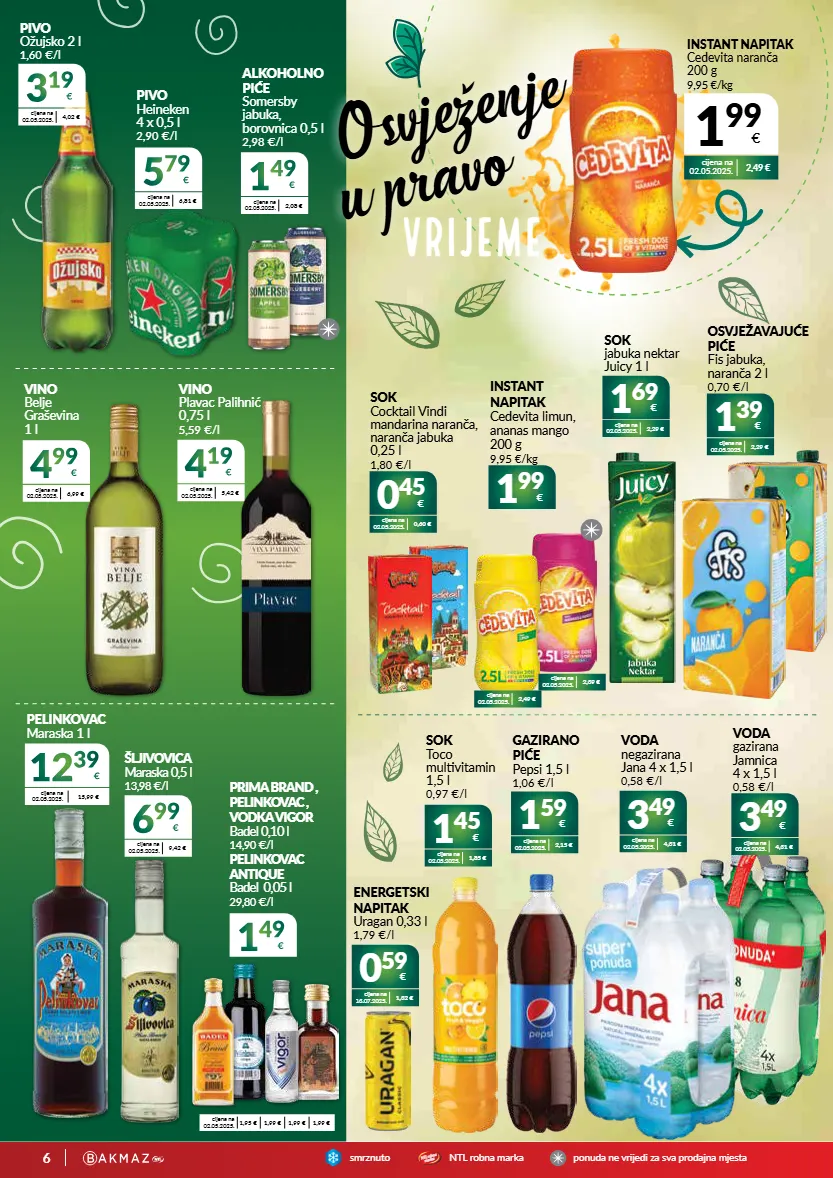 6 smrznutontl r o b n a m a r k a p o n u d a n e v r i j e d i z a s v a p r o d a j n a m j e s t a ntl robna marka 4 99 € cijena na 02.05.2025. 6,99 € vino belje graševina 1 l 4 19 € cijena na 02.05.2025. 5,42 € vino plavac palihnić 0,75 l 5,59 €/l 0 45 € cijena na 02.05.2025. 0,60 € sok cocktail vindi mandarina naranča, naranča jabuka 0,25 l 1,80 €/l 1 39 € cijena na 02.05.2025. 2,29 € osvježavajuće piće fis jabuka, naranča 2 l 0,70 €/l cijena na 02.05.2025. 2,49 € cijena na 02.05.2025. 2,39 € 1 99 € instant napitak cedevita limun, ananas mango 200 g 9,95 €/kg 1 69 € sok jabuka nektar juicy 1 l cijena na 02.05.2025. 2,29 € 0 59 € cijena na 13.07.2025. 1,32 € energetski napitak uragan 0,33 l 1,79 €/l 1 59 € cijena na 02.05.2025. 2,15 € gazirano piće pepsi 1,5 l 1,06 €/l 3 49 € cijena na 02.05.2025. 4,31 € voda negazirana jana 4 x 1,5 l 0,58 €/l 3 49 € cijena na 02.05.2025. 4,31 € voda gazirana jamnica 4 x 1,5 l 0,58 €/l 1 45 € cijena na 02.05.2025. 1,85 € sok toco multivitamin 1,5 l 0,97 €/l 3 19 € cijena na 02.05.2025. 4,02 € pivo ožujsko 2 l 1,60 €/l instant napitak cedevita naranča 200 g 9,95 €/kg 1 99 € cijena na 02.05.2025. 2,49 € osvježenje u pravo vrijeme 1 49 € cijena na 02.05.2025. 2,08 € alkoholno piće somersby jabuka, borovnica 0,5 l 2,98 €/l 5 79 € cijena na 02.05.2025. 6,81 € pivo heineken 4 x 0,5 l 2,90 €/l 6 99 € cijena na 02.05.2025. 9,42 € šljivovica maraska 0,5 l 13,98 €/l pelinkovac maraska 1 l 12 39 € cijena na 02.05.2025. 15,99 € 1 49 € prima brand , pelinkovac , vodka vigor badel 0,10 l 14,90 €/l pelinkovac antique badel 0,05 l 29,80 €/l cijena na 02.05.2025. 1,95 € 1,99 € 1,99 € 1,99 €