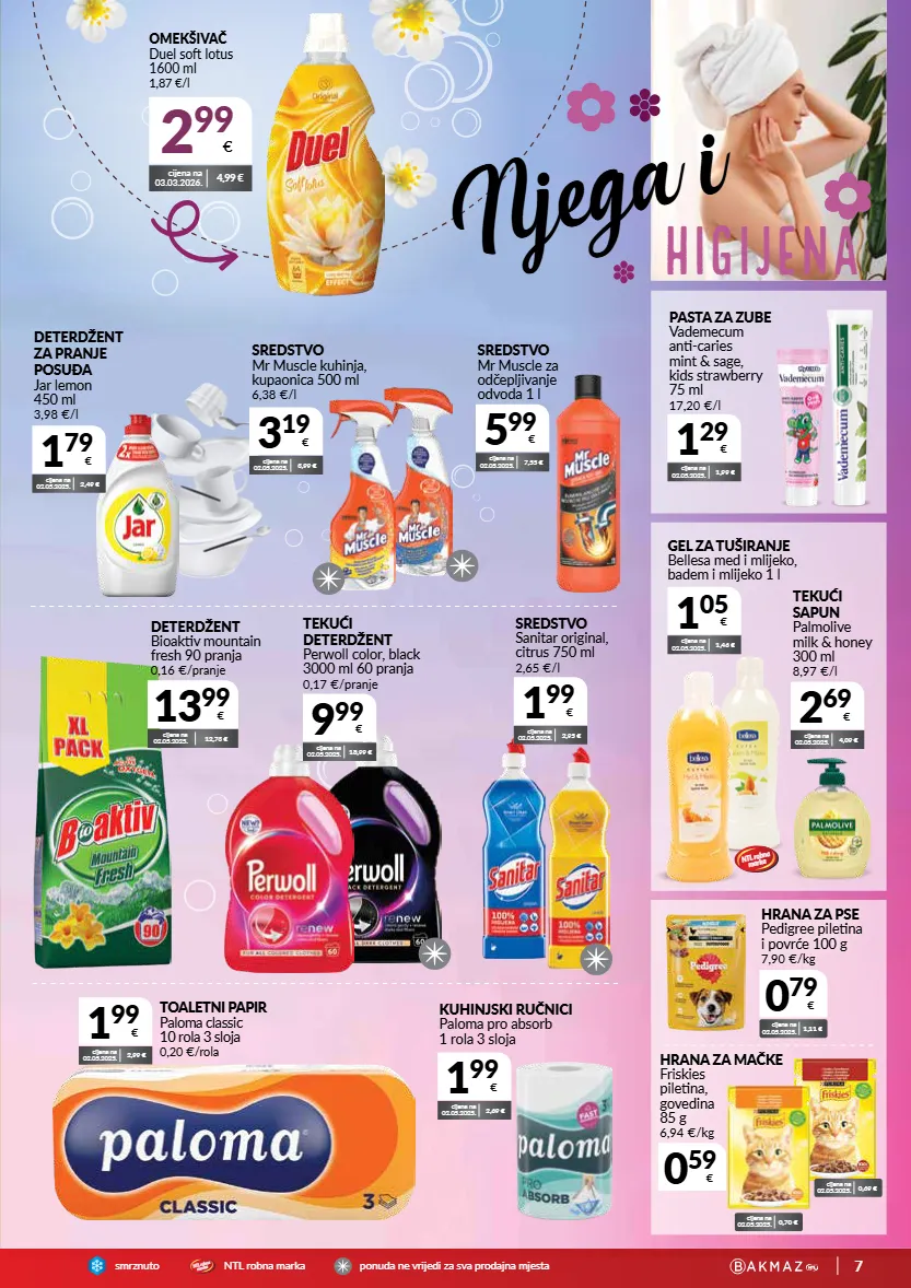 7 smrznutontl r o b n a m a r k a p o n u d a n e v r i j e d i z a s v a p r o d a j n a m j e s t a ntl robna marka 1 99 € cijena na 02.05.2025. 2,69 € kuhinjski ručnici paloma pro absorb 1 rola 3 sloja 1 99 € cijena na 02.05.2025. 2,99 € toaletni papir paloma classic 10 rola 3 sloja 0,20 €/rola njega i higijena 3 19 € cijena na 02.05.2025. 3,99 € sredstvo mr muscle kuhinja, kupaonica 500 ml 6,38 €/l 5 99 € cijena na 02.05.2025. 7,55 € sredstvo mr muscle za odčepljivanje odvoda 1 l cijena na 02.05.2025. 1,11 € 0 79 € hrana za pse pedigree piletina i povrće 100 g 7,90 €/kg omekšivač duel soft lotus 1600 ml 1,87 €/l 2 99 € cijena na 03.03.2026. 4,99 € 9 99 € cijena na 02.05.2025. 18,99 € tekući deterdžent perwoll color, black 3000 ml 60 pranja 0,17 €/pranje 13 99 € cijena na 02.05.2025. 12,73 € deterdžent bioaktiv mountain fresh 90 pranja 0,16 €/pranje 1 99 € cijena na 02.05.2025. 2,95 € sredstvo sanitar original, citrus 750 ml 2,65 €/l pasta za zube vademecum anti-caries mint & sage, kids strawberry 75 ml 17,20 €/l 1 29 € cijena na 02.05.2025. 1,99 € cijena na 02.05.2025. 0,70 € cijena na 02.05.2025. 0,69 € 0 59 € hrana za mačke friskies piletina, govedina 85 g 6,94 €/kg 1 79 € cijena na 02.05.2025. 2,49 € deterdžent za pranje posuđa jar lemon 450 ml 3,98 €/l ntl robna marka 2 69 € cijena na 02.05.2025. 4,09 € tekući sapun palmolive milk & honey 300 ml 8,97 €/l gel za tuširanje bellesa med i mlijeko, badem i mlijeko 1 l 1 05 € cijena na 02.05.2025. 1,46 €