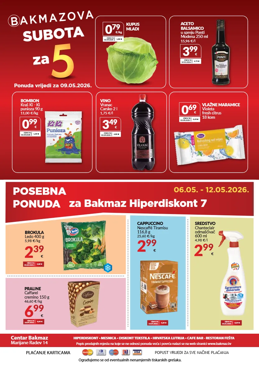 ponuda vrijedi za 09.05.2026. plaćanje karticama ograđujemo se od eventualnih nenamjernih tiskarskih grešaka. popust vrijedi za sve načine plaćanja centar bakmaz marijane radev 14 hiperdiskont • mesnica • diskont tekstila • hrvatska lutrija • cafe bar - restoran fešta popis prodajnih mjesta na koje se ne odnosi ponuda voća i povrća nalazi se na web stranici www.bakmaz.hr b a k m a z o va subota za kapsule macchiato, cappuccino franck 198 g 161,56 kn/kg 21,44 €/kg 31 99 kn 4,25 € posebna ponuda za bakmaz hiperdiskont 7 06.05. - 12.05.2026. cijena na 14.04.2026. 4,29 € brokula ledo 400 g 5,98 €/kg 2 39 € cijena na 02.05.2025. 2,89 € cijena na 22.01.2026. 3,95 € 3 49 € cijena na 02.05.2025. 4,82 € vino vranac carsko 2 l 1,75 €/l 0 69 € cijena na 02.05.2025. 0,95 € vlažne maramice violeta fresh citrus 18 kom 0 79 €/kg cijena na 02.05.2025. 1,89 € kupus mladi 0 99 € cijena na 02.05.2025. 1,39 € bombon kraš ki - ki punioza 90 g 11,00 €/kg 3 99 € cijena na 19.01.2026. 4,79 € aceto balsamico u spreju ponti modena 250 ml 15,96 €/l praline caffarel cremino 150 g 46,60 €/kg 6 99 € cijena na 10.04.2026. 9,99 € cappuccino nescaffé tiramisu 116,8 g 25,60 €/kg 2 99 € sredstvo chanteclair odmašćivač 600 ml 4,98 €/l 2 99 €