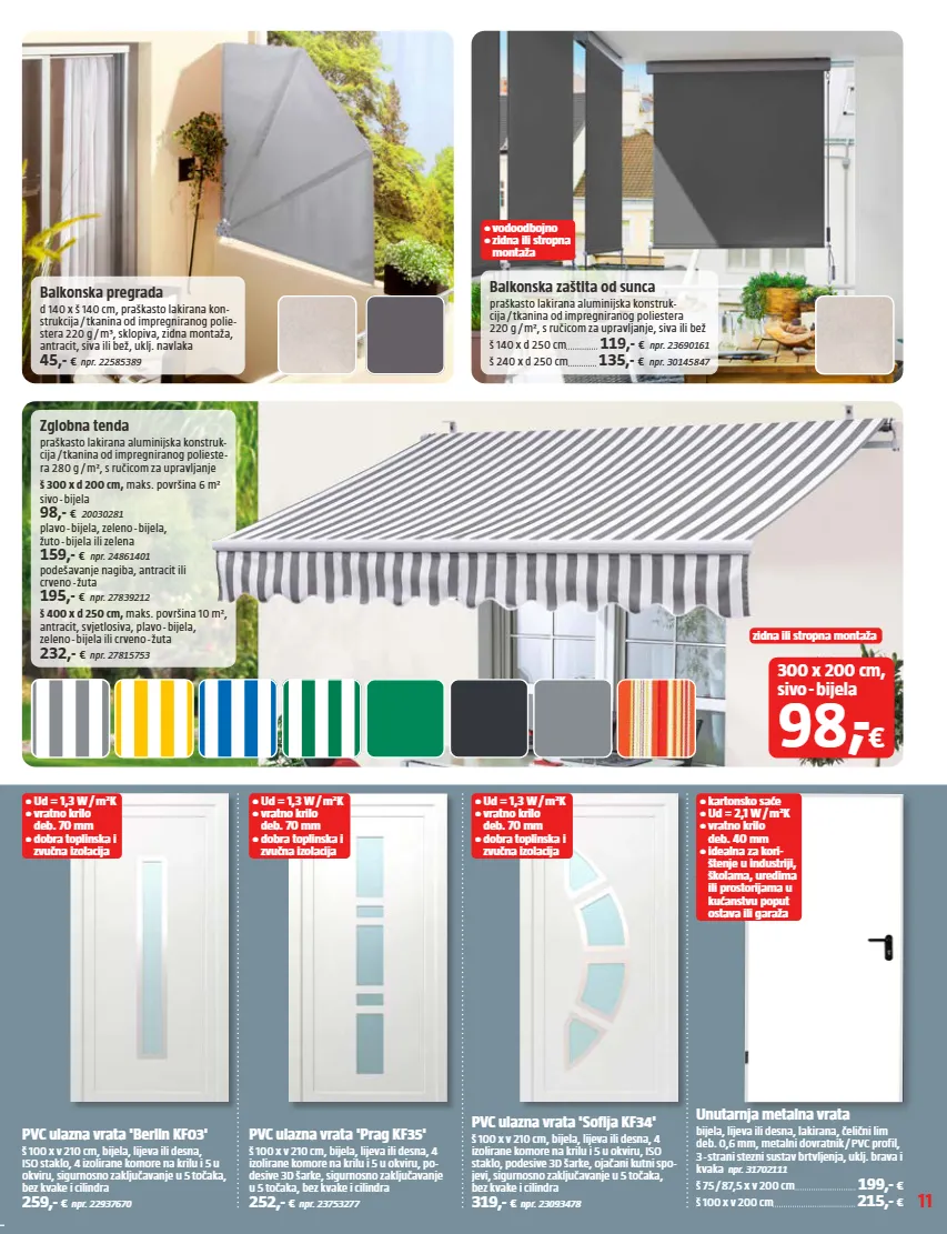 11 • Ud = 1,3 W / m²K • vratno krilo deb. 70 mm • dobra toplinska i zvučna izolacija • Ud = 1,3 W / m²K • vratno krilo deb. 70 mm • dobra toplinska i zvučna izolacija • kartonsko saće • Ud = 2,1 W / m²K • vratno krilo deb. 40 mm • idealna za kori- štenje u industriji, školama, uredima ili prostorijama u kućanstvu poput ostava ili garaža • Ud = 1,3 W / m²K • vratno krilo deb. 70 mm • dobra toplinska i zvučna izolacija • vodoodbojno • zidna ili stropna montaža zidna ili stropna montaža Balkonska zaštita od sunca praškasto lakirana aluminijska konstruk- cija / tkanina od impregniranog poliestera 220 g / m², s ručicom za upravljanje, siva ili bež š 140 x d 250 cm 119,- € npr. 23690161 š 240 x d 250 cm 135,- € npr. 30145847 Zglobna tenda praškasto lakirana aluminijska konstruk- cija / tkanina od impregniranog polieste- ra 280 g / m², s ručicom za upravljanje š 300 x d 200 cm, maks. površina 6 m² sivo - bijela 98,- € 20030281 plavo - bijela, zeleno - bijela, žuto - bijela ili zelena 159,- € npr. 24861401 podešavanje nagiba, antracit ili crveno - žuta 195,- € npr. 27839212 š 400 x d 250 cm, maks. površina 10 m², antracit, svjetlosiva, plavo - bijela, zeleno - bijela ili crveno - žuta 232,- € npr. 27815753 Balkonska pregrada d 140 x š 140 cm, praškasto lakirana kon- strukcija / tkanina od impregniranog polie- stera 220 g / m³, sklopiva, zidna montaža, antracit, siva ili bež, uklj. navlaka 45,- € npr. 22585389 PVC ulazna vrata 'Sofija KF34' š 100 x v 210 cm, bijela, lijeva ili desna, 4 izolirane komore na krilu i 5 u okviru, ISO staklo, podesive 3D šarke, ojačani kutni spo- jevi, sigurnosno zaključavanje u 5 točaka, bez kvake i cilindra 319,- € npr. 23093478 Unutarnja metalna vrata bijela, lijeva ili desna, lakirana, čelični lim deb. 0,6 mm, metalni dovratnik / PVC profil, 3 - strani stezni sustav brtvljenja, uklj. brava i kvaka npr. 31702111 š 75 / 87,5 x v 200 cm 199,- € š 100 x v 200 cm 215,- € PVC ulazna vrata 'Prag KF35' š 100 x v 210 cm, bijela, lijeva ili desna, 4 izolirane komore na krilu i 5 u okviru, po- desive 3D šarke, sigurnosno zaključavanje u 5 točaka, bez kvake i cilindra 252,- € npr. 23753277 PVC ulazna vrata 'Berlin KF03' š 100 x v 210 cm, bijela, lijeva ili desna, ISO staklo, 4 izolirane komore na krilu i 5 u okviru, sigurnosno zaključavanje u 5 točaka, bez kvake i cilindra 259,- € npr. 22937670 300 x 200 cm, sivo - bijela 98 , - €