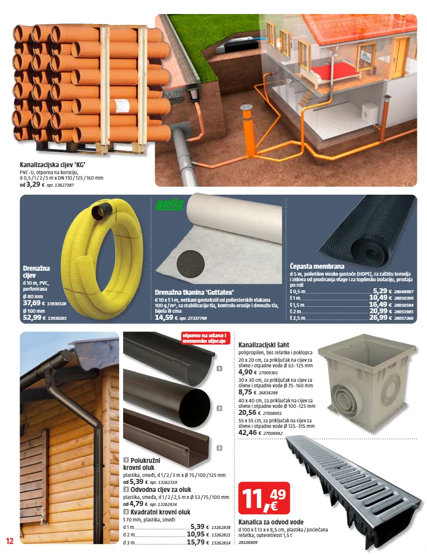 12 otporno na udarce i vremenske utjecaje 1 2 3 Kanalizacijski šaht polipropilen, bez rešetke i poklopca 20 x 20 cm, za priključak na cijev za slivne i otpadne vode Ø 63 - 125 mm 4,90 € 27009361 30 x 30 cm, za priključak na cijev za slivne i otpadne vode Ø 75 - 160 mm 8,75 € 26838298 40 x 40 cm, za priključak na cijev za slivne i otpadne vode Ø 100 - 125 mm 20,56 € 27008951 55 x 55 cm, za priključak na cijev za slivne i otpadne vode Ø 125 - 315 mm 42,46 € 27008942 Drenažna tkanina 'Guttatex' d 10 x š 1 m, netkani geotekstil od poliesterskih vlakana 100 g / m², za stabilizaciju tla, kontrolu erozije i drenažu tla, bijela ili crna 14,59 € npr. 27337798 Drenažna cijev d 10 m, PVC, perforirana Ø 80 mm 37,69 € 13930328 Ø 100 mm 52,99 € 13930201 Čepasta membrana d 5 m, polietilen visoke gustoće (HDPE), za zaštitu temelja i zidova od prodiranja vlage i za toplinsku izolaciju, prodaja po roli š 0,5 m 5,29 € 28048987 š 1 m 10,49 € 28050399 š 1,5 m 16,49 € 28050584 š 2 m 20,99 € 28051985 š 2,5 m 26,99 € 28057266 Kanalica za odvod vode d 100 x š 13 x v 8,5 cm, plastika / pocinčana rešetka, opteretivost 1,5 t 28108809 1 Polukružni krovni oluk plastika, smeđi, d 1 / 2 / 3 m x Ø 75 / 100 / 125 mm od 5,39 € npr. 13262319 2 Odvodna cijev za oluk plastika, smeđa, d 1 / 2 / 2,5 m x Ø 53 / 75 / 100 mm od 4,79 € npr. 13262924 3 Kvadratni krovni oluk š 70 mm, plastika, smeđi d 1 m 5,39 € 13262838 d 2 m 10,95 € 13262821 d 3 m 15,79 € 13262814 Kanalizacijska cijev 'KG' PVC - U, otporna na koroziju, d 0,5 / 1 / 2 / 5 m x DN 110 / 125 / 160 mm od 3,29 € npr. 13627387 11 , € 49