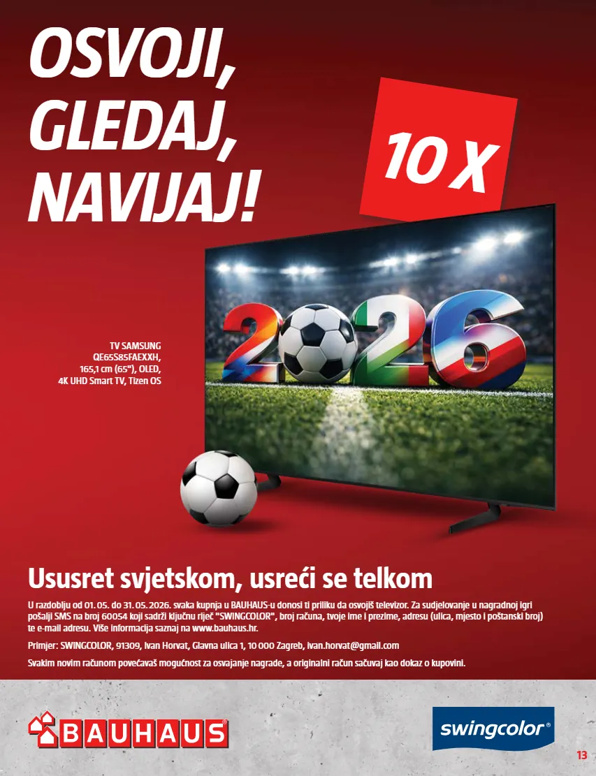 10 x 13 osvoji, gledaj, navijaj! tv samsung qe65s85faexxh, 165,1 cm (65"), oled, 4k uhd smart tv, tizen os ususret svjetskom, usreći se telkom u razdoblju od 01. 05. do 31. 05. 2026. svaka kupnja u bauhaus-u donosi ti priliku da osvojiš televizor. za sudjelovanje u nagradnoj igri pošalji sms na broj 60054 koji sadrži ključnu riječ "swingcolor", broj računa, tvoje ime i prezime, adresu (ulica, mjesto i poštanski broj) te e-mail adresu. više informacija saznaj na www.bauhaus.hr. primjer: swingcolor, 91309, ivan horvat, glavna ulica 1, 10 000 zagreb, ivan.horvat@gmail.com svakim novim računom povećavaš mogućnost za osvajanje nagrade, a originalni račun sačuvaj kao dokaz o kupovini.