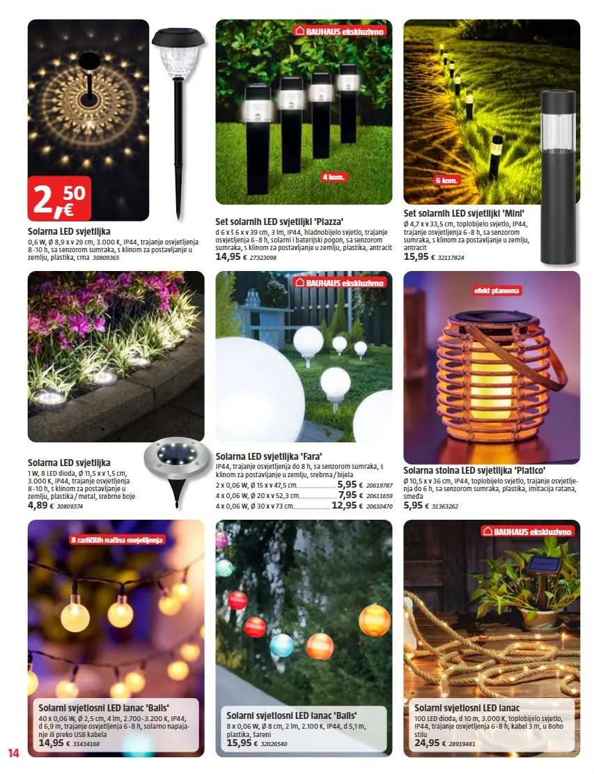 14 bauhaus ekskluzivno bauhaus ekskluzivno 4 kom. efekt plamena 6 kom. 8 različitih načina osvjetljenja bauhaus ekskluzivno set solarnih led svjetiljki 'piazza' d 6 x š 6 x v 39 cm, 3 lm, ip44, hladnobijelo svjetlo, trajanje osvjetljenja 6 - 8 h, solarni i baterijski pogon, sa senzorom sumraka, s klinom za postavljanje u zemlju, plastika, antracit 14,95 € 27323098 solarni svjetlosni led lanac 'balls' 40 x 0,06 w, ø 2,5 cm, 4 lm, 2.700 - 3.200 k, ip44, d 6,9 m, trajanje osvjetljenja 6 - 8 h, solarno napaja- nje ili preko usb kabela 14,95 € 31434168 solarni svjetlosni led lanac 100 led dioda, d 10 m, 3.000 k, toplobijelo svjetlo, ip44, trajanje osvjetljenja 6 - 8 h, kabel 3 m, u boho stilu 24,95 € 28919481 solarni svjetlosni led lanac 'balls' 8 x 0,06 w, ø 8 cm, 2 lm, 2.100 k, ip44, d 5,1 m, plastika, šareni 15,95 € 32026540 solarna stolna led svjetiljka 'platico' ø 10,5 x v 36 cm, ip44, toplobijelo svjetlo, trajanje osvjetlje- nja do 6 h, sa senzorom sumraka, plastika, imitacija ratana, smeđa 5,95 € 31363262 solarna led svjetiljka 0,6 w, ø 8,9 x v 29 cm, 3.000 k, ip44, trajanje osvjetljenja 8 - 10 h, sa senzorom sumraka, s klinom za postavljanje u zemlju, plastika, crna 30809365 set solarnih led svjetiljki 'mini' ø 4,7 x v 33,5 cm, toplobijelo svjetlo, ip44, trajanje osvjetljenja 6 - 8 h, sa senzorom sumraka, s klinom za postavljanje u zemlju, antracit 15,95 € 32117824 2 , € 50 solarna led svjetiljka 'fara' ip44, trajanje osvjetljenja do 8 h, sa senzorom sumraka, s klinom za postavljanje u zemlju, srebrna / bijela 2 x 0,06 w, ø 15 x v 47,5 cm 5,95 € 20619787 4 x 0,06 w, ø 20 x v 52,3 cm 7,95 € 20611659 4 x 0,06 w, ø 30 x v 73 cm 12,95 € 20610470 solarna led svjetiljka 1 w, 8 led dioda, ø 11,5 x v 1,5 cm, 3.000 k, ip44, trajanje osvjetljenja 8 - 10 h, s klinom za postavljanje u zemlju, plastika / metal, srebrne boje 4,89 € 30809374