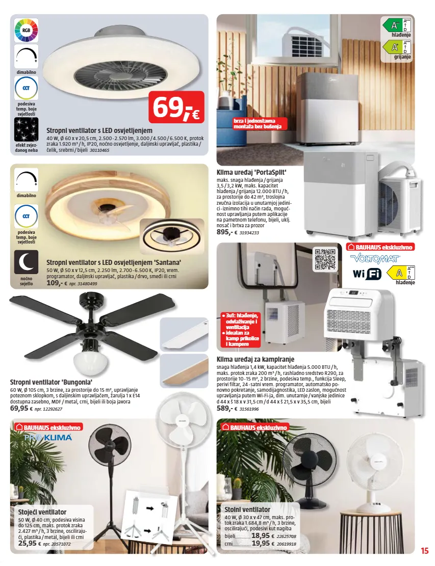 15 podesiva temp. boje svjetlosti cct + - dimabilno noćno svjetlo rgb podesiva temp. boje svjetlosti cct + - dimabilno efekt zvjez- danog neba brza i jednostavna montaža bez bušenja bauhaus ekskluzivno • 3u1: hlađenje, odvlaživanje i ventilacija • idealan za kamp prikolice i kampere bauhaus ekskluzivno bauhaus ekskluzivno hlađenje d a +++ grijanje + d a +++ hlađenje ++ d a +++ stropni ventilator s led osvjetljenjem 40 w, ø 60 x v 20,5 cm, 2.500 - 2.570 lm, 3.000 / 4.500 / 6.500 k, protok zraka 1.920 m³ / h, ip20, noćno osvjetljenje, daljinski upravljač, plastika / čelik, srebrni / bijeli 30110465 stropni ventilator s led osvjetljenjem 'santana' 50 w, ø 50 x v 12,5 cm, 2.250 lm, 2.700 - 6.500 k, ip20, vrem. programator, daljinski upravljač, plastika / drvo, smeđi ili crni 109,- € npr. 31480499 klima uređaj za kampiranje snaga hlađenja 1,4 kw, kapacitet hlađenja 5.000 btu / h, maks. protok zraka 200 m³ / h, rashladno sredstvo r290, za prostorije 10 - 15 m², 2 brzine, podesiva temp., funkcija sleep, perivi filtar, 24 - satni vrem. programator, automatsko po- novno pokretanje, samodijagnostika, led zaslon, mogućnost upravljanja putem wi-fi-ja, dim. unutarnje / vanjske jedinice d 44 x š 18 x v 31,5 cm / d 44 x š 21,5 x v 35,5 cm, bijeli 589,- € 31561996 stropni ventilator 'bungonia' 60 w, ø 105 cm, 3 brzine, za prostorije do 15 m², upravljanje poteznom sklopkom, s daljinskim upravljačem, žarulja 1 x e14 dostupna zasebno, mdf / metal, crni, bijeli ili boja javora 69,95 € npr. 12292627 stolni ventilator 40 w, ø 30 x v 47 cm, maks. pro- tok zraka 1.684,8 m³ / h, 3 brzine, oscilirajući, podesivi kut nagiba bijeli 18,95 € 22625708 crni 19,95 € 20619918 stojeći ventilator 50 w, ø 40 cm, podesiva visina do 125 cm, maks. protok zraka 2.427 m³ / h, 3 brzine, osciliraju- ći, plastika / metal, bijeli ili crni 25,95 € npr. 20571072 klima uređaj 'portasplit' maks. snaga hlađenja / grijanja 3,5 / 3,2 kw, maks. kapacitet hlađenja / grijanja 12.000 btu / h, za prostorije do 42 m², troslojna zvučna izolacija u unutarnjoj jedini- ci - iznimno tihi način rada, moguć- nost upravljanja putem aplikacije na pametnom telefonu, bijeli, uklj. nosač i brtva za prozor 895,- € 31934233 69, - €