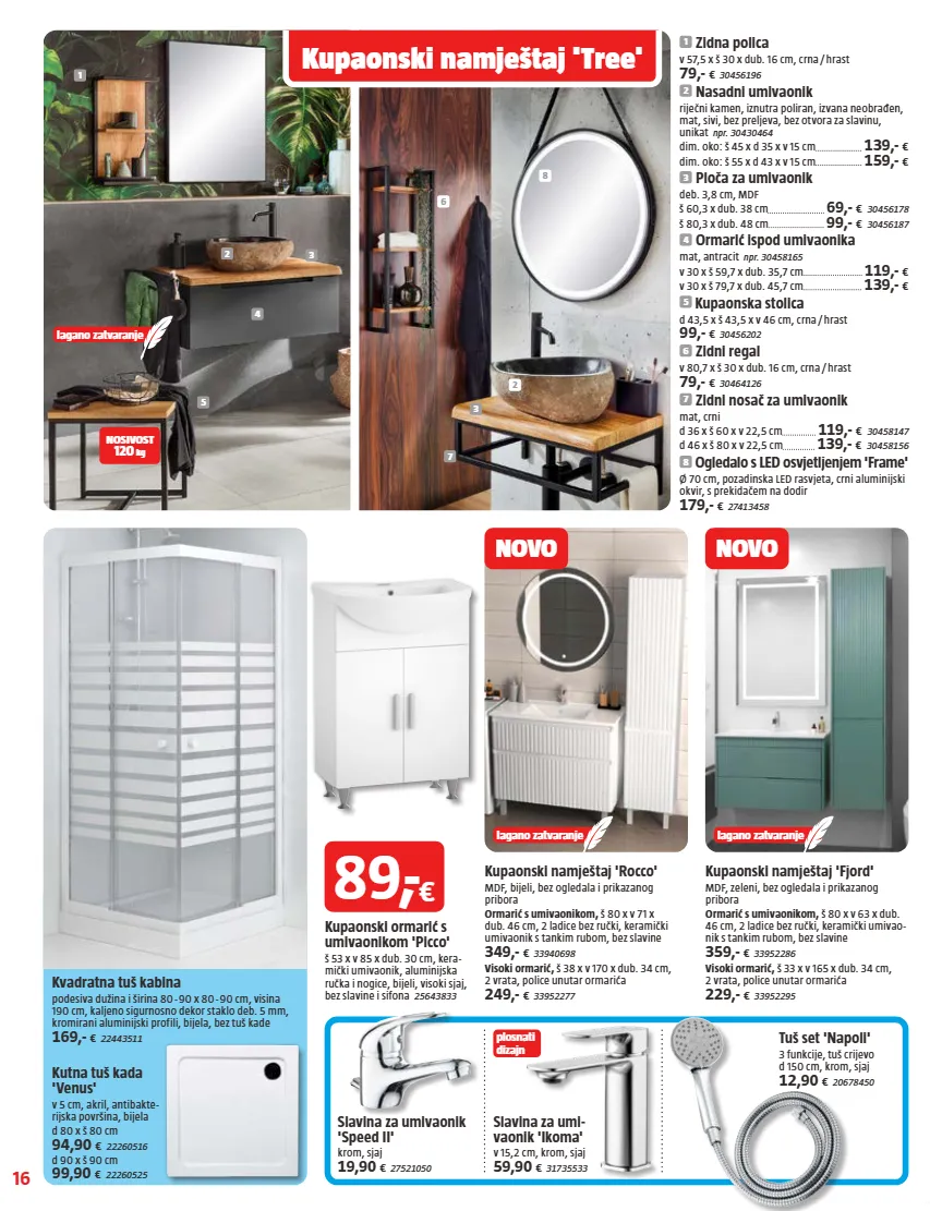 16 1 3 2 2 3 7 8 5 6 4 plosnati dizajn lagano zatvaranje lagano zatvaranje lagano zatvaranje nosivost 120 kg kupaonski namještaj 'tree' novo novo slavina za umivaonik 'speed ii' krom, sjaj 19,90 € 27521050 1 zidna polica v 57,5 x š 30 x dub. 16 cm, crna / hrast 79,- € 30456196 2 nasadni umivaonik riječni kamen, iznutra poliran, izvana neobrađen, mat, sivi, bez preljeva, bez otvora za slavinu, unikat npr. 30430464 dim. oko: š 45 x d 35 x v 15 cm 139,- € dim. oko: š 55 x d 43 x v 15 cm 159,- € 3 ploča za umivaonik deb. 3,8 cm, mdf š 60,3 x dub. 38 cm 69,- € 30456178 š 80,3 x dub. 48 cm 99,- € 30456187 4 ormarić ispod umivaonika mat, antracit npr. 30458165 v 30 x š 59,7 x dub. 35,7 cm 119,- € v 30 x š 79,7 x dub. 45,7 cm 139,- € 5 kupaonska stolica d 43,5 x š 43,5 x v 46 cm, crna / hrast 99,- € 30456202 6 zidni regal v 80,7 x š 30 x dub. 16 cm, crna / hrast 79,- € 30464126 7 zidni nosač za umivaonik mat, crni d 36 x š 60 x v 22,5 cm 119,- € 30458147 d 46 x š 80 x v 22,5 cm 139,- € 30458156 8 ogledalo s led osvjetljenjem 'frame' ø 70 cm, pozadinska led rasvjeta, crni aluminijski okvir, s prekidačem na dodir 179,- € 27413458 kupaonski namještaj 'fjord' mdf, zeleni, bez ogledala i prikazanog pribora ormarić s umivaonikom, š 80 x v 63 x dub. 46 cm, 2 ladice bez ručki, keramički umivao- nik s tankim rubom, bez slavine 359,- € 33952286 visoki ormarić, š 33 x v 165 x dub. 34 cm, 2 vrata, police unutar ormarića 229,- € 33952295 kupaonski namještaj 'rocco' mdf, bijeli, bez ogledala i prikazanog pribora ormarić s umivaonikom, š 80 x v 71 x dub. 46 cm, 2 ladice bez ručki, keramički umivaonik s tankim rubom, bez slavine 349,- € 33940698 visoki ormarić, š 38 x v 170 x dub. 34 cm, 2 vrata, police unutar ormarića 249,- € 33952277 tuš set 'napoli' 3 funkcije, tuš crijevo d 150 cm, krom, sjaj 12,90 € 20678450 slavina za umi- vaonik 'ikoma' v 15,2 cm, krom, sjaj 59,90 € 31735533 kutna tuš kada 'venus' v 5 cm, akril, antibakte- rijska površina, bijela d 80 x š 80 cm 94,90 € 22260516 d 90 x š 90 cm 99,90 € 22260525 kvadratna tuš kabina podesiva dužina i širina 80 - 90 x 80 - 90 cm, visina 190 cm, kaljeno sigurnosno dekor staklo deb. 5 mm, kromirani aluminijski profili, bijela, bez tuš kade 169,- € 22443511 kupaonski ormarić s umivaonikom 'picco' š 53 x v 85 x dub. 30 cm, kera- mički umivaonik, aluminijska ručka i nogice, bijeli, visoki sjaj, bez slavine i sifona 25643833 89, - €