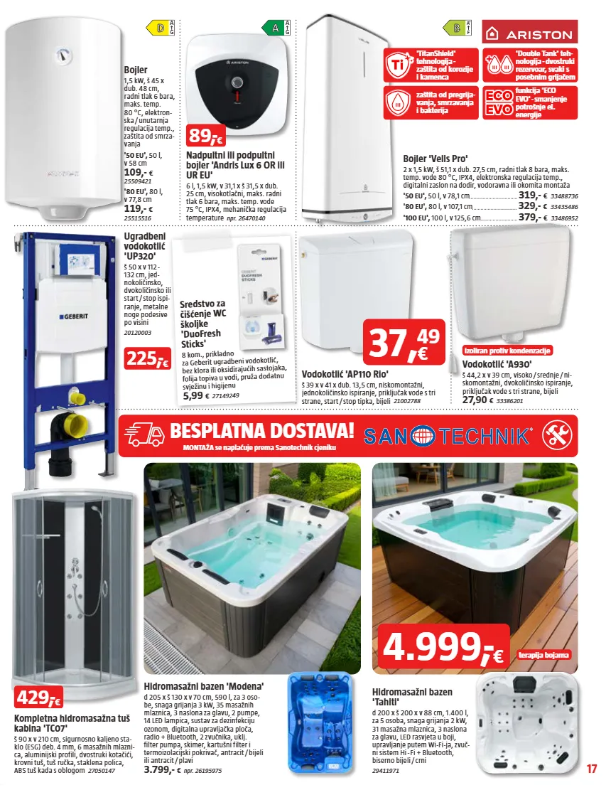 17 'titanshield' tehnologija - zaštita od korozije i kamenca zaštita od pregrija- vanja, smrzavanja i bakterija funkcija 'eco evo' - smanjenje potrošnje el. energije 'double tank' teh- nologija - dvostruki rezervoar, svaki s posebnim grijačem izoliran protiv kondenzacije terapija bojama besplatna dostava! montaža se naplaćuje prema sanotechnik cjeniku d a g a a g f a + kompletna hidromasažna tuš kabina 'tc07' š 90 x v 210 cm, sigurnosno kaljeno sta- klo (esg) deb. 4 mm, 6 masažnih mlazni- ca, aluminijski profili, dvostruki kotačići, krovni tuš, tuš ručka, staklena polica, abs tuš kada s oblogom 27050147 hidromasažni bazen 'tahiti' d 200 x š 200 x v 88 cm, 1.400 l, za 5 osoba, snaga grijanja 2 kw, 31 masažna mlaznica, 3 naslona za glavu, led rasvjeta u boji, upravljanje putem wi-fi-ja, zvuč- ni sistem hi - fi + bluetooth, biserno bijeli / crni 29411971 hidromasažni bazen 'modena' d 205 x š 130 x v 70 cm, 590 l, za 3 oso- be, snaga grijanja 3 kw, 35 masažnih mlaznica, 3 naslona za glavu, 2 pumpe, 14 led lampica, sustav za dezinfekciju ozonom, digitalna upravljačka ploča, radio + bluetooth, 2 zvučnika, uklj. filter pumpa, skimer, kartušni filter i termoizolacijski pokrivač, antracit / bijeli ili antracit / plavi 3.799,- € npr. 26195975 ugradbeni vodokotlić 'up320' š 50 x v 112 - 132 cm, jed- nokoličinsko, dvokoličinsko ili start / stop ispi- ranje, metalne noge podesive po visini 20120003 vodokotlić 'ap110 rio' š 39 x v 41 x dub. 13,5 cm, niskomontažni, jednokoličinsko ispiranje, priključak vode s tri strane, start / stop tipka, bijeli 21002788 sredstvo za čišćenje wc školjke 'duofresh sticks' 8 kom., prikladno za geberit ugradbeni vodokotlić, bez klora ili oksidirajućih sastojaka, folija topiva u vodi, pruža dodatnu svježinu i higijenu 5,99 € 27149249 vodokotlić 'a930' š 44,2 x v 39 cm, visoko / srednje / ni - skomontažni, dvokoličinsko ispiranje, priključak vode s tri strane, bijeli 27,90 € 33386201 nadpultni ili podpultni bojler 'andris lux 6 or ili ur eu' 6 l, 1,5 kw, v 31,1 x š 31,5 x dub. 25 cm, visokotlačni, maks. radni tlak 6 bara, maks. temp. vode 75 °c, ipx4, mehanička regulacija temperature npr. 26470140 bojler 'velis pro' 2 x 1,5 kw, š 51,1 x dub. 27,5 cm, radni tlak 8 bara, maks. temp. vode 80 °c, ipx4, elektronska regulacija temp., digitalni zaslon na dodir, vodoravna ili okomita montaža '50 eu', 50 l, v 78,1 cm 319,- € 33488736 '80 eu', 80 l, v 107,1 cm 329,- € 33435486 '100 eu', 100 l, v 125,6 cm 379,- € 33486952 37 , € 49 4.999, - € bojler 1,5 kw, š 45 x dub. 48 cm, radni tlak 6 bara, maks. temp. 80 °c, elektron- ska / unutarnja regulacija temp., zaštita od smrza- vanja '50 eu', 50 l, v 58 cm 109,- € 25509421 '80 eu', 80 l, v 77,8 cm 119,- € 25515516 89, - € 225, - € 429, - €