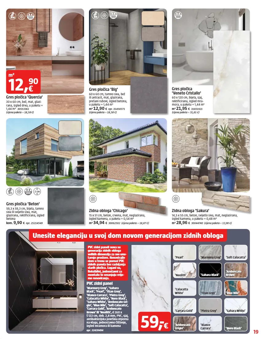 19 R10 R9 'Pearl' 'Neolith' 'Calacatta White' 'Carrara Gold' 'Arebescato Grigio' 'Soft Calacatta' 'Arebescato Brown' 'Blue Nile' 'Sahara White' 'Nero Black' 'Marmory Grey' 'Sahara Black' 'Titan Grey' 'Pietra Grey' 'Bianco Carrara' Unesite eleganciju u svoj dom novom generacijom zidnih obloga PVC zidni paneli nova su generacija zidnih obloga velikih dimenzija za sve unu- tarnje prostore. Renovirajte dom u trenu uz pomoć PVC zidnih panela bez razbijanja starih pločica. Lagani su, fleksibilni, jednostavni za montažu te smanjuju vrije- me renoviranja. 2 cm R11 PVC zidni panel 'Marmory Grey', 'Sahara Black', 'Pearl', 'Titan Grey', 'Bianco Carrara', 'Pietra Grey', 'Calacatta White', 'Nero Black', 'Sahara White', 'Arebescato Gri- gio', 'Blue Nile', 'Soft Calacatta', 'Carrara Gold', 'Arebescato Brown' ili 'Neolith', d 260 x š 122 cm, deb. 2,8 mm, PVC, sjaj, antibakterijska površina otporna na vlagu, jednostavno čišćenje, izgled mramora ili kamena npr. 32439494 Zidna obloga 'Chicago' 15 x 51 cm, beton, crvena, mat, neglazirana, izgled kamena, u paketu = 0,54 m² m² 34,94 € 30062502 (cijena paketa = 18,87 €) Gres pločica 'Beton' 59,3 x 59,3 cm, bijela, tamno siva ili svijetlo siva, mat, glazirana, rektificirana, izgled betona kom. 9,90 € npr. 25214549 Gres pločica 'Veneto Cristallo' 60 x 120 cm, bijela, sjaj, rektificirana, izgled mra- mora, u paketu = 1,44 m² m² 21,95 € 31651921 (cijena paketa = 31,61 €) Gres pločica 'Big' 60 x 60 cm, tamno siva, bež ili antracit, mat, glazirana, prešani rubovi, izgled betona, u paketu = 1,44 m² m² 12,90 € npr. 31458371 (cijena paketa = 18,58 €) Gres pločica 'Quercia' 30 x 60 cm, bež, mat, glazi- rana, izgled drva, u paketu = 1,44 m² 30553361 (cijena paketa = 18,58 €) m² 12, € 90 59, - € Zidna obloga 'Sakura' 14,5 x 55 cm, beton, svijetlo siva, mat, neglazirana, izgled kamena, u paketu = 0,48 m² m² 28,96 € 30044740 (cijena paketa = 13,90 €)