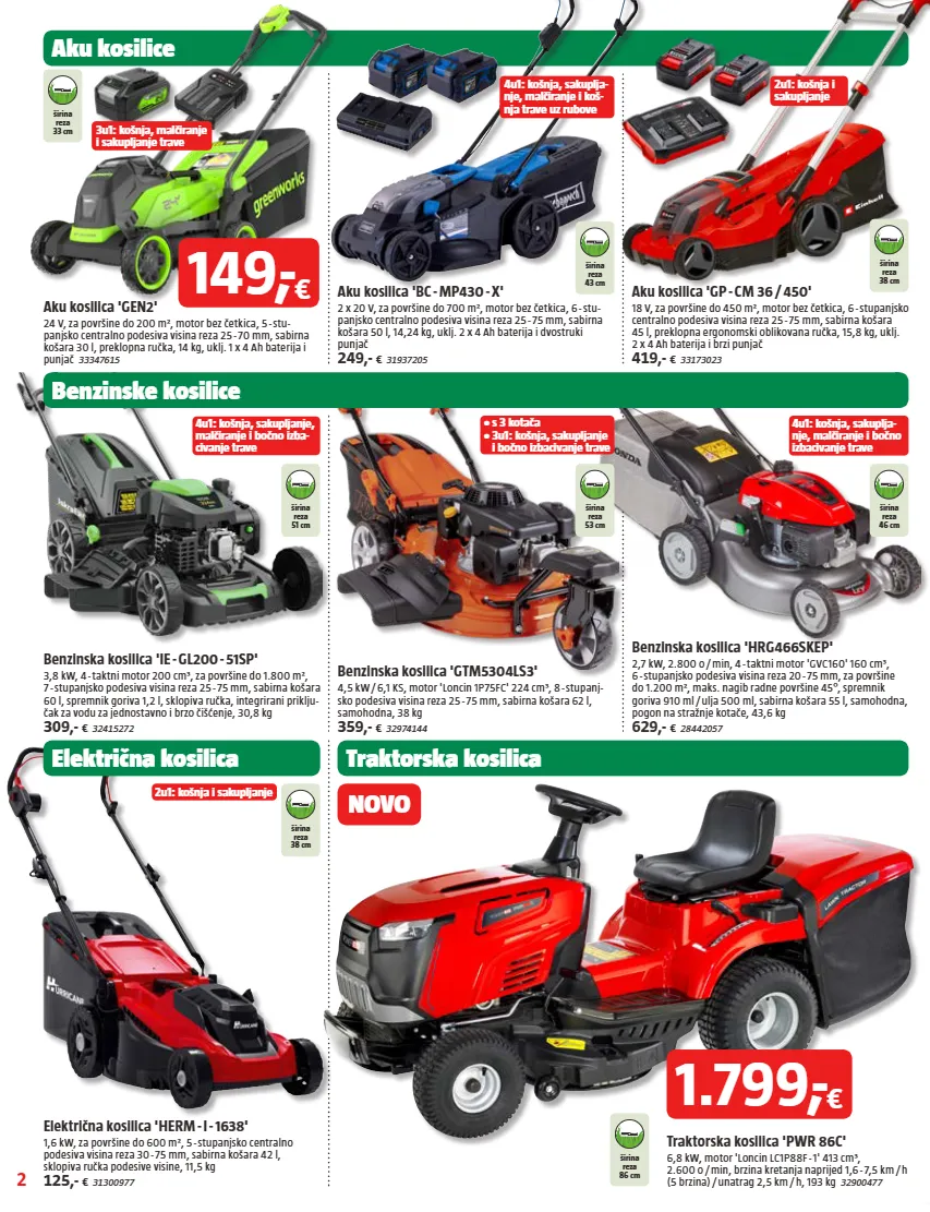 aku kosilice 2 benzinske kosilice električna kosilica traktorska kosilica 4u1: košnja, sakuplja- nje, malčiranje i koš- nja trave uz rubove 4u1: košnja, sakupljanje, malčiranje i bočno izba- civanje trave 2u1: košnja i sakupljanje 4u1: košnja, sakuplja- nje, malčiranje i bočno izbacivanje trave 3u1: košnja, malčiranje i sakupljanje trave 2u1: košnja i sakupljanje širina reza 38 cm širina reza 86 cm širina reza 43 cm širina reza 51 cm širina reza 53 cm širina reza 46 cm širina reza 38 cm širina reza 33 cm • s 3 kotača • 3u1: košnja, sakupljanje i bočno izbacivanje trave novo aku kosilica 'gen2' 24 v, za površine do 200 m², motor bez četkica, 5 - stu- panjsko centralno podesiva visina reza 25 - 70 mm, sabirna košara 30 l, preklopna ručka, 14 kg, uklj. 1 x 4 ah baterija i punjač 33347615 aku kosilica 'gp - cm 36 / 450' 18 v, za površine do 450 m², motor bez četkica, 6 - stupanjsko centralno podesiva visina reza 25 - 75 mm, sabirna košara 45 l, preklopna ergonomski oblikovana ručka, 15,8 kg, uklj. 2 x 4 ah baterija i brzi punjač 419,- € 33173023 benzinska kosilica 'gtm5304ls3' 4,5 kw / 6,1 ks, motor 'loncin 1p75fc' 224 cm³, 8 - stupanj- sko podesiva visina reza 25 - 75 mm, sabirna košara 62 l, samohodna, 38 kg 359,- € 32974144 traktorska kosilica 'pwr 86c' 6,8 kw, motor 'loncin lc1p88f - 1' 413 cm³, 2.600 o / min, brzina kretanja naprijed 1,6 - 7,5 km / h (5 brzina) / unatrag 2,5 km / h, 193 kg 32900477 benzinska kosilica 'ie - gl200 - 51sp' 3,8 kw, 4 - taktni motor 200 cm³, za površine do 1.800 m², 7 - stupanjsko podesiva visina reza 25 - 75 mm, sabirna košara 60 l, spremnik goriva 1,2 l, sklopiva ručka, integrirani priklju- čak za vodu za jednostavno i brzo čišćenje, 30,8 kg 309,- € 32415272 električna kosilica 'herm - i - 1638' 1,6 kw, za površine do 600 m², 5 - stupanjsko centralno podesiva visina reza 30 - 75 mm, sabirna košara 42 l, sklopiva ručka podesive visine, 11,5 kg 125,- € 31300977 benzinska kosilica 'hrg466skep' 2,7 kw, 2.800 o / min, 4 - taktni motor 'gvc160' 160 cm³, 6 - stupanjsko podesiva visina reza 20 - 75 mm, za površine do 1.200 m², maks. nagib radne površine 45°, spremnik goriva 910 ml / ulja 500 ml, sabirna košara 55 l, samohodna, pogon na stražnje kotače, 43,6 kg 629,- € 28442057 aku kosilica 'bc - mp430 - x' 2 x 20 v, za površine do 700 m², motor bez četkica, 6 - stu- panjsko centralno podesiva visina reza 25 - 75 mm, sabirna košara 50 l, 14,24 kg, uklj. 2 x 4 ah baterija i dvostruki punjač 249,- € 31937205 149, - € 1.799, - €