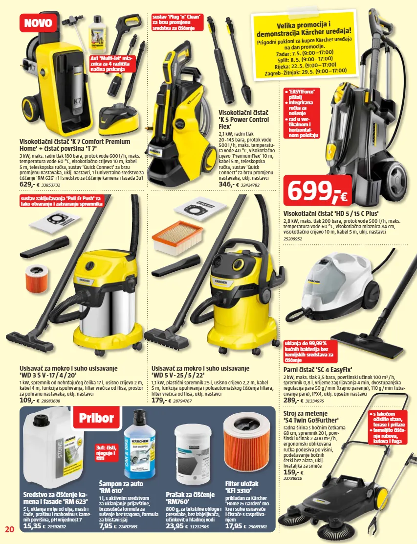 20 • 'easy!force' pištolj • integrirana ručka za nošenje • rad u ver- tikalnom i horizontal- nom položaju sustav 'plug 'n' clean' za brzu promjenu sredstva za čišćenje 4u1 'multi-jet' mla- znica za 4 različita načina prskanja uklanja do 99,99 % kućnih bakterija bez kemijskih sredstava za čišćenje sustav zaključavanja 'pull & push' za lako otvaranje i zatvaranje spremnika 3u1: čisti, njeguje i štiti pribor novo velika promocija i demonstracija kärcher uređaja! prigodni pokloni za kupce kärcher uređaja na dan promocije. zadar: 7. 5. (9:00 – 17:00) split: 8. 5. (9:00 – 17:00) rijeka: 22. 5. (9:00 – 17:00) zagreb - žitnjak: 29. 5. (9:00 – 17:00) filter uložak 'kfi 3310' prikladan za kärcher 'home & garden' mo- kre i suhe usisavače i čistače s raspršiva- njem 17,95 € 29083361 šampon za auto 'rm 610' 1 l, s aktivnim sredstvom za uklanjanje prljavštine, brzosušeća formula za sušenje bez tragova, formula za blistavi sjaj 7,95 € 22437985 usisavač za mokro i suho usisavanje 'wd 3 s v - 17 / 4 / 20' 1 kw, spremnik od nehrđajućeg čelika 17 l, usisno crijevo 2 m, kabel 4 m, funkcija ispuhivanja, filter vrećica od flisa, prostor za pohranu nastavaka, uklj. nastavci 109,- € 28983608 usisavač za mokro i suho usisavanje 'wd 5 v - 25 / 5 / 22' 1,1 kw, plastični spremnik 25 l, usisno crijevo 2,2 m, kabel 5 m, funkcija ispuhivanja i poluautomatskog čišćenja filtera, filter vrećica od flisa, uklj. nastavci 179,- € 28794767 parni čistač 'sc 4 easyfix' 2 kw, maks. tlak 3,5 bara, površinski učinak 100 m² / h, spremnik 0,8 l, vrijeme zagrijavanja 4 min, dvostupanjska regulacija pare 50 g / min (trajno parenje), 110 g / min (izba- civanje pare), ipx4, uklj. opsežni nastavci 289,- € 31334976 sredstvo za čišćenje ka- mena i fasade 'rm 623' 5 l, uklanja mrlje od ulja, masti i čađe, prašinu i mahovinu s kame- nih površina, ph vrijednost 7 15,35 € 21592632 prašak za čišćenje 'rm760' 800 g, za tekstilne obloge i presvlake, bez izbjeljivača, učinkovit u hladnoj vodi 23,95 € 11212505 visokotlačni čistač 'k 5 power control flex' 2,1 kw, radni tlak 20 - 145 bara, protok vode 500 l / h, maks. temperatu - ra vode 40 °c, visokotlačno cijevo 'premiumflex' 10 m, kabel 5 m, teleskopska ručka, sustav 'quick connect' za brzu promjenu nastavaka, uklj. nastavci 346,- € 32424782 visokotlačni čistač 'k 7 comfort premium home' + čistač površina 't 7' 3 kw, maks. radni tlak 180 bara, protok vode 600 l / h, maks. temperatura vode 60 °c, visokotlačno crijevo 10 m, kabel 5 m, teleskopska ručka, sustav 'quick connect' za brzu promjenu nastavaka, uklj. nastavci, 1 l univerzalno sredstvo za čišćenje 'rm 626' i 1 l sredstvo za čišćenje kamena i fasada 3u1 629,- € 33853732 visokotlačni čistač 'hd 5 / 15 c plus' 2,8 kw, maks. tlak 200 bara, protok vode 500 l / h, maks. temperatura vode 60 °c, visokotlačna mlaznica 84 cm, visokotlačno crijevo 10 m, kabel 5 m, uklj. nastavci 25209952 699, - € • s lakoćom očistite staze, terase i prilaze • temeljito čišće- nje rubova, kutova i fuga stroj za metenje 's4 twin go!further' radna širina s bočnim četkama 68 cm, spremnik 20 l, povr- šinski učinak 2.400 m² / h, ergonomski oblikovana ručka podesiva po visini, podešavanje bočnih četki bez alata, uklj. hvataljka za smeće 159,- € 33788816