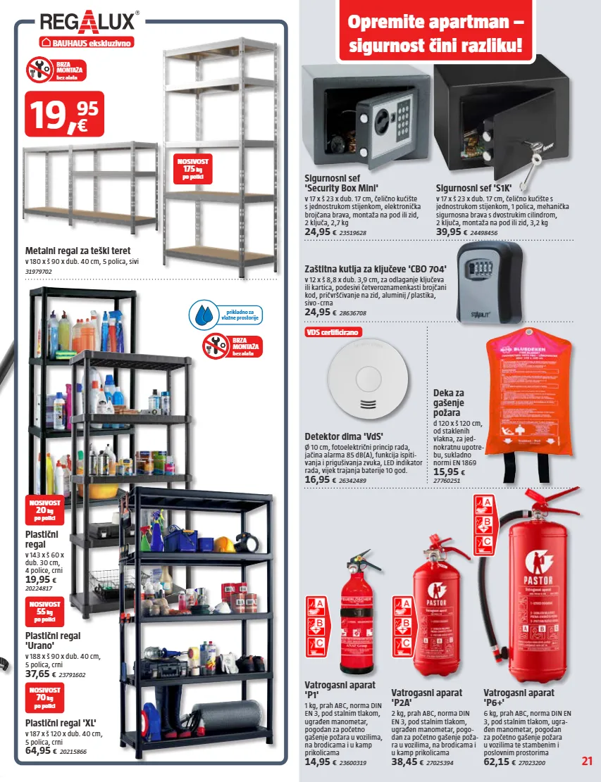 21 nosivost 20 kg po polici nosivost 70 kg po polici nosivost 55 kg po polici bauhaus ekskluzivno brza montaža bez alata brza montaža bez alata prikladno za vlažne prostorije opremite apartman – sigurnost čini razliku! vds certificirano nosivost 175 kg po polici metalni regal za teški teret v 180 x š 90 x dub. 40 cm, 5 polica, sivi 31979702 sigurnosni sef 's1k' v 17 x š 23 x dub. 17 cm, čelično kućište s jednostrukom stijenkom, 1 polica, mehanička sigurnosna brava s dvostrukim cilindrom, 2 ključa, montaža na pod ili zid, 3,2 kg 39,95 € 24498456 zaštitna kutija za ključeve 'cbo 704' v 12 x š 8,8 x dub. 3,9 cm, za odlaganje ključeva ili kartica, podesivi četveroznamenkasti brojčani kod, pričvršćivanje na zid, aluminij / plastika, sivo - crna 24,95 € 28636708 sigurnosni sef 'security box mini' v 17 x š 23 x dub. 17 cm, čelično kućište s jednostrukom stijenkom, elektronička brojčana brava, montaža na pod ili zid, 2 ključa, 2,7 kg 24,95 € 23519628 detektor dima 'vds' ø 10 cm, fotoelektrični princip rada, jačina alarma 85 db(a), funkcija ispiti- vanja i prigušivanja zvuka, led indikator rada, vijek trajanja baterije 10 god. 16,95 € 26342489 deka za gašenje požara d 120 x š 120 cm, od staklenih vlakna, za jed- nokratnu upotre- bu, sukladno normi en 1869 15,95 € 27760251 plastični regal 'urano' v 188 x š 90 x dub. 40 cm, 5 polica, crni 37,65 € 23791602 plastični regal v 143 x š 60 x dub. 30 cm, 4 police, crni 19,95 € 20224817 plastični regal 'xl' v 187 x š 120 x dub. 40 cm, 5 polica, crni 64,95 € 20215866 19 , € 95 vatrogasni aparat 'p1' 1 kg, prah abc, norma din en 3, pod stalnim tlakom, ugrađen manometar, pogodan za početno gašenje požara u vozilima, na brodicama i u kamp prikolicama 14,95 € 23600319 vatrogasni aparat 'p2a' 2 kg, prah abc, norma din en 3, pod stalnim tlakom, ugrađen manometar, pogo- dan za početno gašenje poža- ra u vozilima, na brodicama i u kamp prikolicama 38,45 € 27025394 vatrogasni aparat 'p6+' 6 kg, prah abc, norma din en 3, pod stalnim tlakom, ugra- đen manometar, pogodan za početno gašenje požara u vozilima te stambenim i poslovnim prostorima 62,15 € 27023200