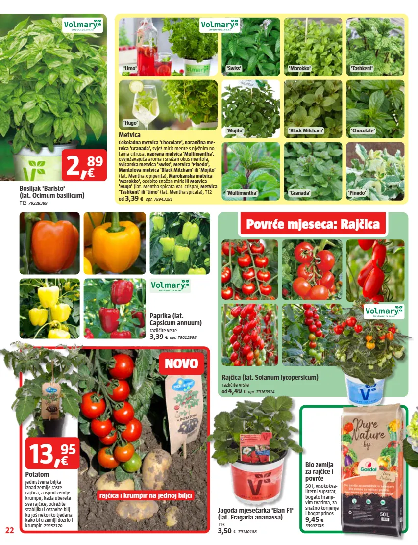 22 'limo' 'hugo' 'swiss' 'marokko' 'tashkent' 'mojito' 'multimentha' 'black mitcham' 'granada' 'chocolate' 'pinedo' povrće mjeseca: rajčica rajčica i krumpir na jednoj biljci novo metvica čokoladna metvica 'chocolate', narančina me- tvica 'granada', svjež miris mente s nježnim no- tama citrusa, paprena metvica 'multimentha', osvježavajuća aroma i snažan okus mentola, švicarska metvica 'swiss', metvica 'pinedo', mentolova metvica 'black mitcham' ili 'mojito' (lat. mentha x piperita), marokanska metvica 'marokko', osobito snažan miris ili metvica 'hugo' (lat. mentha spicata var. crispa), metvica 'tashkent' ili 'limo' (lat. mentha spicata), t12 od 3,39 € npr. 78943281 paprika (lat. capsicum annuum) različite vrste 3,39 € npr. 79015998 rajčica (lat. solanum lycopersicum) različite vrste od 4,49 € npr. 79163514 jagoda mjesečarka 'elan f1' (lat. fragaria ananassa) t13 3,50 € 79180188 bosiljak 'baristo' (lat. ocimum basilicum) t12 79228389 2 , € 89 13 , € 95 bio zemlja za rajčice i povrće 50 l, visokokva- litetni supstrat, bogato hranji- vim tvarima, za snažno korijenje i bogat prinos 9,45 € 33907745 potatom jedinstvena biljka – iznad zemlje raste rajčica, a ispod zemlje krumpir, kada uberete sve rajčice, odrežite stabljiku i ostavite bilj- ku još nekoliko tjedana kako bi u zemlji dozrio i krumpir 79257170