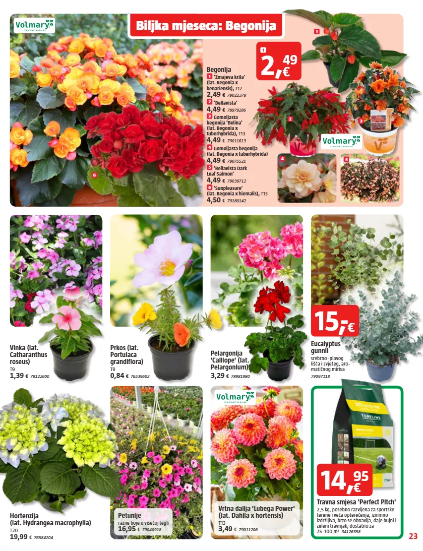 23 2 4 3 5 6 1 Biljka mjeseca: Begonija Vrtna dalija 'Lubega Power' (lat. Dahlia x hortensis) T13 3,49 € 79011206 Begonija 1 'Zmajeva krila' (lat. Begonia x benariensis), T12 2,49 € 79022378 2 'Bellavista' 4,49 € 78979286 3 Gomoljasta begonija 'Belina' (lat. Begonia x tuberhybrida), T13 4,49 € 79011613 4 Gomoljasta begonija (lat. Begonia x tuberhybrida) 4,49 € 79075521 5 'Bellavista Dark Leaf Salmon' 4,49 € 79039712 6 'Sunpleasure' (lat. Begonia x hiemalis), T13 4,50 € 79180142 1 2, € 49 Prkos (lat. Portulaca grandiflora) T9 0,84 € 76539602 Vinka (lat. Catharanthus roseus) T9 1,39 € 78122600 Pelargonija 'Calliope' (lat. Pelargonium) 3,29 € 78981980 Eucalyptus gunnii srebrno - plavog lišća i svježeg, aro- matičnog mirisa 79097118 Petunije razne boje u visećoj tegli 16,95 € 79040918 Hortenzija (lat. Hydrangea macrophylla) T20 19,99 € 76584204 14 , € 95 Travna smjesa 'Perfect Pitch' 2,5 kg, posebno razvijena za sportske terene i veća opterećenja, iznimno izdržljiva, brzo se obnavlja, daje bujni i zeleni travnjak, dostatno za 75 - 100 m ² 34126358 15, - €