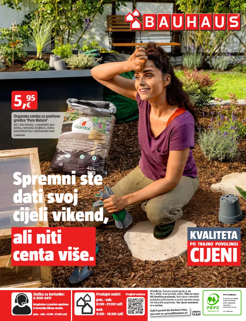 Služba za korisnike: 0 800 4411 Besplatno za pozive upućene iz hrvatske fiksne mreže. pon. - sub.: 8:00 - 21:00 sati Pregled centara Želiš li postati dio Bauhaus tima, javi nam se: posao@bauhaus.hr Prodajni centri: pon. - sub. 8:00 - 21:00 sati ned. 9:00 - 14:00 sati PEFC/56-31-06 PEFC Certificirano Ovaj proizvod potje č e iz šuma kojima se održivo gospodari, recikliranih i kontroliranih izvora www.pefc.org HZ 05A/26. Ponuda vrijedi od 29. 4. do 19. 5. 2026. ili do prodaje zaliha. Slika ne mora biti identična proizvodu. Kod cijena i tehničkih podataka pridržavamo se prava ispravka mogu- ćih tiskarskih pogrešaka. Sve cijene navedene su u eurima. Spremni ste dati svoj cijeli vikend, ali niti centa više. KVALITETA PO TRAJNO POVOLJNOJ CIJENI Organska zemlja za povišene gredice 'Pure Nature' 40 l, bez treseta, s organskim gno- jivima, rastresita struktura, dobra prozračnost tla i zadržavanje vode 33886400 5 , € 95