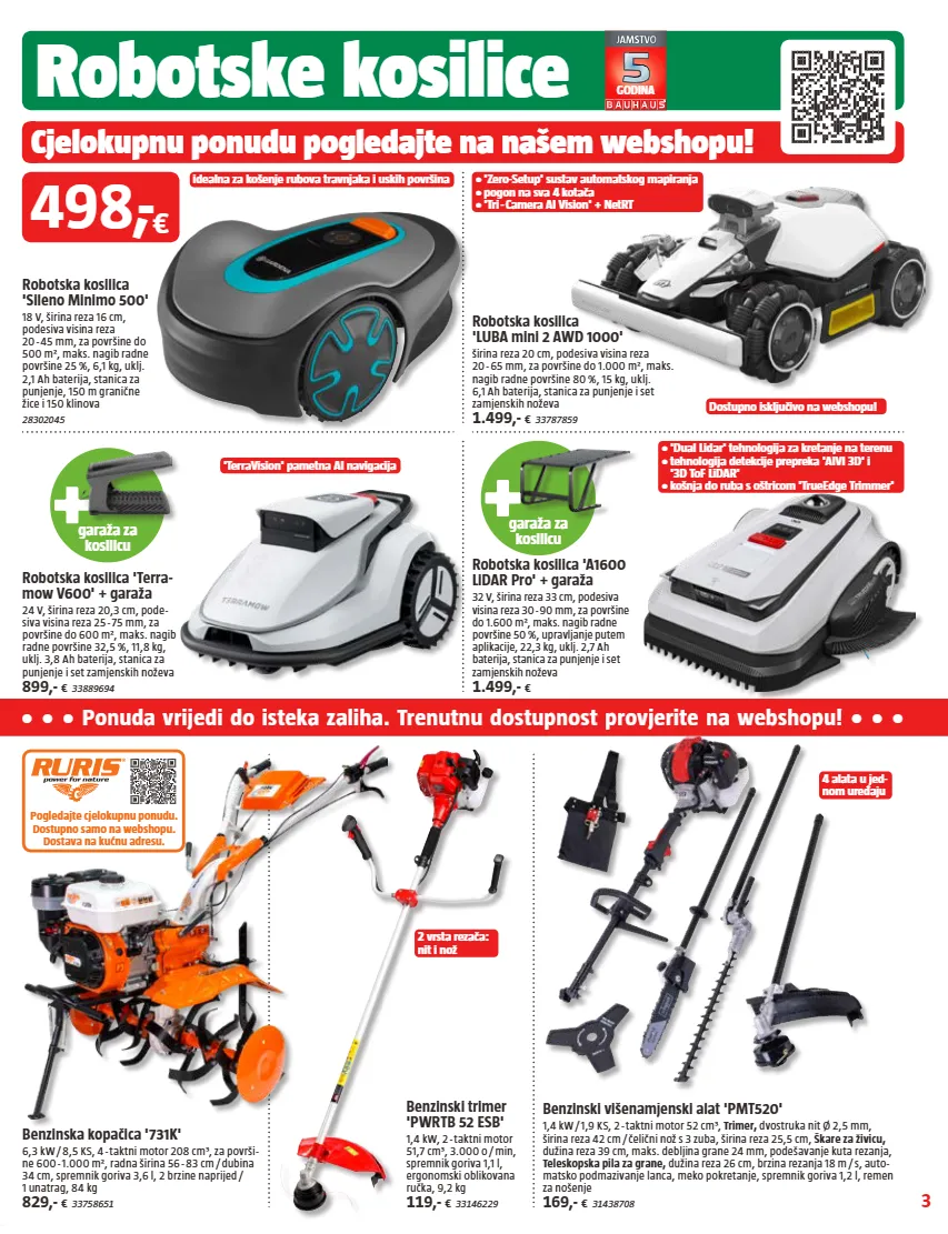 3 robotske kosilice godina 4 alata u jed- nom uređaju 2 vrsta rezača: nit i nož pogledajte cjelokupnu ponudu. dostupno samo na webshopu. dostava na kućnu adresu. cjelokupnu ponudu pogledajte na našem webshopu! • 'dual lidar' tehnologija za kretanje na terenu • tehnologija detekcije prepreka 'aivi 3d' i '3d tof lidar' • košnja do ruba s oštricom 'trueedge trimmer' garaža za kosilicu garaža za kosilicu idealna za košenje rubova travnjaka i uskih površina 'terravision' pametna ai navigacija dostupno isključivo na webshopu! • 'zero-setup' sustav automatskog mapiranja • pogon na sva 4 kotača • 'tri - camera ai vision' + netrt • • • ponuda vrijedi do isteka zaliha. trenutnu dostupnost provjerite na webshopu! • • • benzinska kopačica '731k' 6,3 kw / 8,5 ks, 4 - taktni motor 208 cm³, za površi- ne 600 - 1.000 m², radna širina 56 - 83 cm / dubina 34 cm, spremnik goriva 3,6 l, 2 brzine naprijed / 1 unatrag, 84 kg 829,- € 33758651 benzinski trimer 'pwrtb 52 esb' 1,4 kw, 2 - taktni motor 51,7 cm³, 3.000 o / min, spremnik goriva 1,1 l, ergonomski oblikovana ručka, 9,2 kg 119,- € 33146229 benzinski višenamjenski alat 'pmt520' 1,4 kw / 1,9 ks, 2 - taktni motor 52 cm³, trimer, dvostruka nit ø 2,5 mm, širina reza 42 cm / čelični nož s 3 zuba, širina reza 25,5 cm, škare za živicu, dužina reza 39 cm, maks. debljina grane 24 mm, podešavanje kuta rezanja, teleskopska pila za grane, dužina reza 26 cm, brzina rezanja 18 m / s, auto- matsko podmazivanje lanca, meko pokretanje, spremnik goriva 1,2 l, remen za nošenje 169,- € 31438708 498, - € robotska kosilica 'luba mini 2 awd 1000' širina reza 20 cm, podesiva visina reza 20 - 65 mm, za površine do 1.000 m², maks. nagib radne površine 80 %, 15 kg, uklj. 6,1 ah baterija, stanica za punjenje i set zamjenskih noževa 1.499,- € 33787859 robotska kosilica 'sileno minimo 500' 18 v, širina reza 16 cm, podesiva visina reza 20 - 45 mm, za površine do 500 m², maks. nagib radne površine 25 %, 6,1 kg, uklj. 2,1 ah baterija, stanica za punjenje, 150 m granične žice i 150 klinova 28302045 robotska kosilica 'a1600 lidar pro' + garaža 32 v, širina reza 33 cm, podesiva visina reza 30 - 90 mm, za površine do 1.600 m², maks. nagib radne površine 50 %, upravljanje putem aplikacije, 22,3 kg, uklj. 2,7 ah baterija, stanica za punjenje i set zamjenskih noževa 1.499,- € robotska kosilica 'terra- mow v600' + garaža 24 v, širina reza 20,3 cm, pode- siva visina reza 25 - 75 mm, za površine do 600 m², maks. nagib radne površine 32,5 %, 11,8 kg, uklj. 3,8 ah baterija, stanica za punjenje i set zamjenskih noževa 899,- € 33889694
