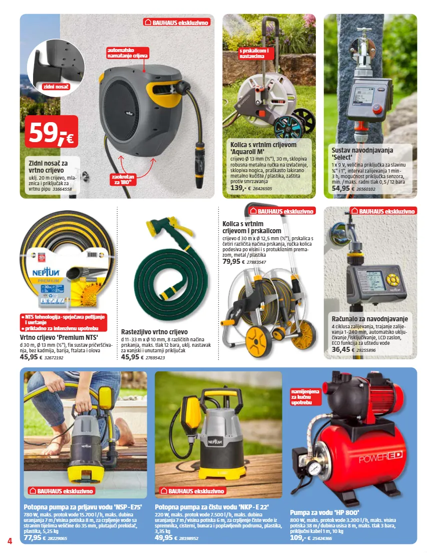 4 bauhaus ekskluzivno bauhaus ekskluzivno bauhaus ekskluzivno zaokretan za 180° zidni nosač automatsko namatanje crijeva s prskalicom i nastavcima namijenjena za kućnu upotrebu bauhaus ekskluzivno bauhaus ekskluzivno • nts tehnologija - sprječava petljanje i uvrtanje • prikladno za intenzivnu upotrebu vrtno crijevo 'premium nts' d 30 m, ø 13 mm (½"), fix sustav pričvršćiva- nja, bez kadmija, barija, ftalata i olova 45,95 € 32672192 rastezljivo vrtno crijevo d 11 - 33 m x ø 10 mm, 8 različitih načina prskanja, maks. tlak 12 bara, uklj. nastavak za vanjski i unutarnji priključak 45,95 € 27695423 potopna pumpa za prljavu vodu 'nsp - e75' 780 w, maks. protok vode 15.700 l / h, maks. dubina uranjanja 7 m / visina potiska 8 m, za crpljenje vode sa stranim tijelima veličine do 35 mm, plutajući prekidač, plastika, 5,25 kg 77,95 € 28229065 potopna pumpa za čistu vodu 'nkp - e 22' 220 w, maks. protok vode 7.500 l / h, maks. dubina uranjanja 7 m / visina potiska 6 m, za crpljenje čiste vode iz spremnika, cisterni, bunara i poplavljenih podruma, plastika, 3,35 kg 49,95 € 28198952 pumpa za vodu 'hp 800' 800 w, maks. protok vode 3.200 l / h, maks. visina potiska 38 m / dubina usisa 8 m, maks. tlak 3 bara, priključni kabel 1 m, 10 kg 109,- € 25424366 sustav navodnjavanja 'select' 1 x 9 v, veličina priključka za slavinu 3/4" i 1", interval zalijevanja 1 min - 3 h, mogućnost priključka senzora, min. / maks. radni tlak 0,5 / 12 bara 54,95 € 26560102 računalo za navodnjavanje 4 ciklusa zalijevanja, trajanje zalije- vanja 1 - 240 min, automatsko uklju- čivanje / isključivanje, lcd zaslon, eco funkcija za uštedu vode 36,45 € 29255896 kolica s vrtnim crijevom i prskalicom crijevo d 30 m x ø 12,5 mm (½"), prskalica s četiri različita načina prskanja, ručka kolica podesiva po visini i s protukliznim prema- zom, metal / plastika 79,95 € 27883547 kolica s vrtnim crijevom 'aquaroll m' crijevo ø 13 mm (½"), 30 m, sklopiva robusna metalna ručka na izvlačenje, sklopiva nogica, praškasto lakirano metalno kućište / plastika, zaštita protiv smrzavanja 139,- € 26426505 zidni nosač za vrtno crijevo uklj. 20 m crijevo, mla- znica i priključak za vrtnu pipu 31664558 59, - €