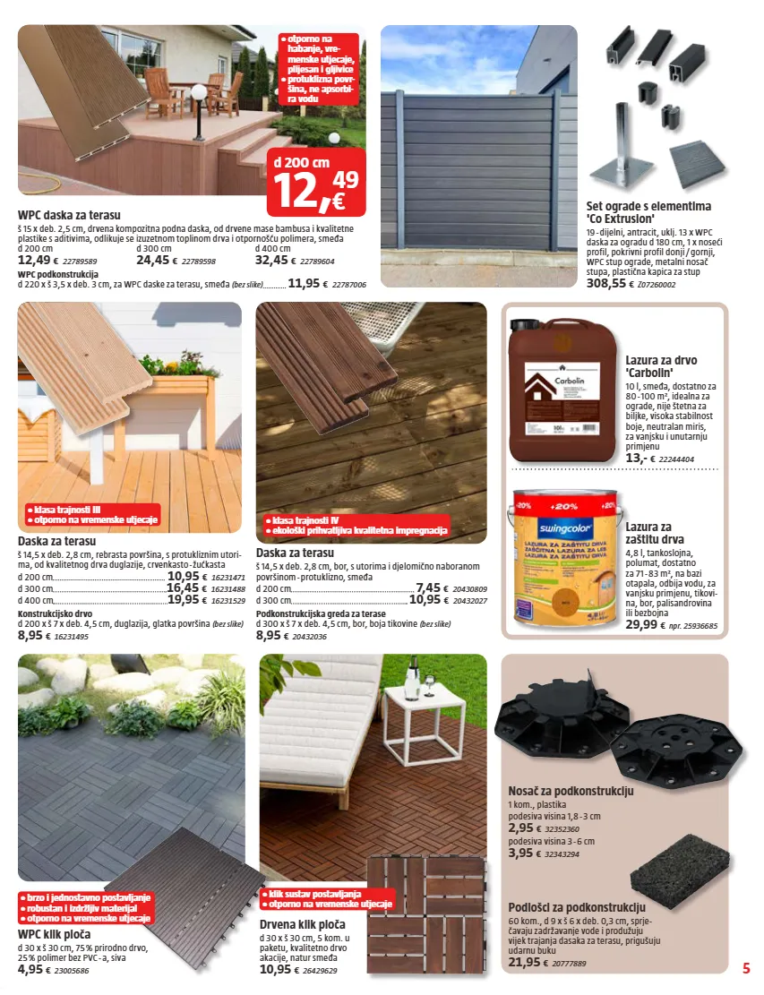 5 • otporno na habanje, vre- menske utjecaje, plijesan i gljivice • protuklizna povr- šina, ne apsorbi- ra vodu • klasa trajnosti III • otporno na vremenske utjecaje • klasa trajnosti IV • ekološki prihvatljiva kvalitetna impregnacija • klik sustav postavljanja • otporno na vremenske utjecaje • brzo i jednostavno postavljanje • robustan i izdržljiv materijal • otporno na vremenske utjecaje WPC klik ploča d 30 x š 30 cm, 75 % prirodno drvo, 25 % polimer bez PVC - a, siva 4,95 € 23005686 Podlošci za podkonstrukciju 60 kom., d 9 x š 6 x deb. 0,3 cm, sprje- čavaju zadržavanje vode i produžuju vijek trajanja dasaka za terasu, prigušuju udarnu buku 21,95 € 20777889 Nosač za podkonstrukciju 1 kom., plastika podesiva visina 1,8 - 3 cm 2,95 € 32352360 podesiva visina 3 - 6 cm 3,95 € 32343294 Drvena klik ploča d 30 x š 30 cm, 5 kom. u paketu, kvalitetno drvo akacije, natur smeđa 10,95 € 26429629 Daska za terasu š 14,5 x deb. 2,8 cm, bor, s utorima i djelomično naboranom površinom - protuklizno, smeđa d 200 cm 7,45 € 20430809 d 300 cm 10,95 € 20432027 Podkonstrukcijska greda za terase d 300 x š 7 x deb. 4,5 cm, bor, boja tikovine (bez slike) 8,95 € 20432036 Daska za terasu š 14,5 x deb. 2,8 cm, rebrasta površina, s protukliznim utori- ma, od kvalitetnog drva duglazije, crvenkasto - žućkasta d 200 cm 10,95 € 16231471 d 300 cm 16,45 € 16231488 d 400 cm 19,95 € 16231529 Konstrukcijsko drvo d 200 x š 7 x deb. 4,5 cm, duglazija, glatka površina (bez slike) 8,95 € 16231495 WPC daska za terasu š 15 x deb. 2,5 cm, drvena kompozitna podna daska, od drvene mase bambusa i kvalitetne plastike s aditivima, odlikuje se izuzetnom toplinom drva i otpornošću polimera, smeđa d 200 cm 12,49 € 22789589 d 300 cm 24,45 € 22789598 d 400 cm 32,45 € 22789604 WPC podkonstrukcija d 220 x š 3,5 x deb. 3 cm, za WPC daske za terasu, smeđa (bez slike) 11,95 € 22787006 d 200 cm 12, € 49 Set ograde s elementima 'Co Extrusion' 19 - dijelni, antracit, uklj. 13 x WPC daska za ogradu d 180 cm, 1 x noseći profil, pokrivni profil donji / gornji, WPC stup ograde, metalni nosač stupa, plastična kapica za stup 308,55 € Z07260002 Lazura za drvo 'Carbolin' 10 l, smeđa, dostatno za 80 - 100 m², idealna za ograde, nije štetna za biljke, visoka stabilnost boje, neutralan miris, za vanjsku i unutarnju primjenu 13,- € 22244404 Lazura za zaštitu drva 4,8 l, tankoslojna, polumat, dostatno za 71 - 83 m ² , na bazi otapala, odbija vodu, za vanjsku primjenu, tikovi- na, bor, palisandrovina ili bezbojna 29,99 € npr. 25936685
