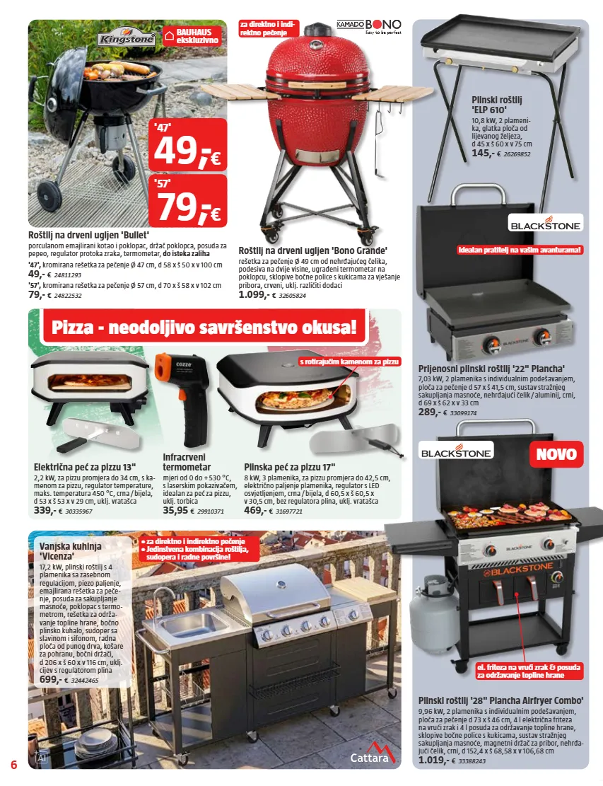 6 ai pizza - neodoljivo savršenstvo okusa! s rotirajućim kamenom za pizzu bauhaus ekskluzivno za direktno i indi- rektno pečenje • za direktno i indirektno pečenje • jedinstvena kombinacija roštilja, sudopera i radne površine! el. friteza na vrući zrak & posuda za održavanje topline hrane idealan pratitelj na vašim avanturama! novo vanjska kuhinja 'vicenza' 17,2 kw, plinski roštilj s 4 plamenika sa zasebnom regulacijom, piezo paljenje, emajlirana rešetka za peče- nje, posuda za sakupljanje masnoće, poklopac s termo- metrom, rešetka za održa- vanje topline hrane, bočno plinsko kuhalo, sudoper sa slavinom i sifonom, radna ploča od punog drva, košare za pohranu, bočni držači, d 206 x š 60 x v 116 cm, uklj. cijev s regulatorom plina 699,- € 32442465 plinski roštilj '28" plancha airfryer combo' 9,96 kw, 2 plamenika s individualnim podešavanjem, ploča za pečenje d 73 x š 46 cm, 4 l električna friteza na vrući zrak i 4 l posuda za održavanje topline hrane, sklopive bočne police s kukicama, sustav stražnjeg sakupljanja masnoće, magnetni držač za pribor, nehrđa- jući čelik, crni, d 152,4 x š 68,58 x v 106,68 cm 1.019,- € 33388243 roštilj na drveni ugljen 'bono grande' rešetka za pečenje ø 49 cm od nehrđajućeg čelika, podesiva na dvije visine, ugrađeni termometar na poklopcu, sklopive bočne police s kukicama za vješanje pribora, crveni, uklj. različiti dodaci 1.099,- € 32605824 prijenosni plinski roštilj '22" plancha' 7,03 kw, 2 plamenika s individualnim podešavanjem, ploča za pečenje d 57 x š 41,5 cm, sustav stražnjeg sakupljanja masnoće, nehrđajući čelik / aluminij, crni, d 69 x š 62 x v 33 cm 289,- € 33099174 infracrveni termometar mjeri od 0 do + 530 °c, s laserskim pokazivačem, idealan za peć za pizzu, uklj. torbica 35,95 € 29910371 plinski roštilj 'elp 610' 10,8 kw, 2 plameni- ka, glatka ploča od lijevanog željeza, d 45 x š 60 x v 75 cm 145,- € 26269852 roštilj na drveni ugljen 'bullet' porculanom emajlirani kotao i poklopac, držač poklopca, posuda za pepeo, regulator protoka zraka, termometar, do isteka zaliha '47', kromirana rešetka za pečenje ø 47 cm, d 58 x š 50 x v 100 cm 49,- € 24811293 '57', kromirana rešetka za pečenje ø 57 cm, d 70 x š 58 x v 102 cm 79,- € 24822532 plinska peć za pizzu 17" 8 kw, 3 plamenika, za pizzu promjera do 42,5 cm, električno paljenje plamenika, regulator s led osvjetljenjem, crna / bijela, d 60,5 x š 60,5 x v 30,5 cm, bez regulatora plina, uklj. vratašca 469,- € 31697721 električna peć za pizzu 13" 2,2 kw, za pizzu promjera do 34 cm, s ka- menom za pizzu, regulator temperature, maks. temperatura 450 °c, crna / bijela, d 53 x š 53 x v 29 cm, uklj. vratašca 339,- € 30335967 '47' 49 , - € '57' 79 , - €