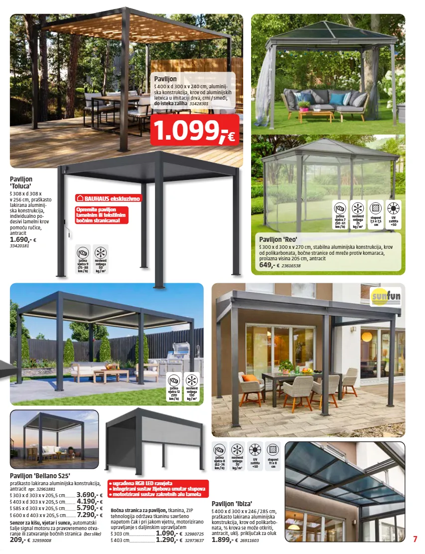 7 jačina vjetra 9 (75 - 88 km / h) nosivost snijega 50 kg / m² Opremite paviljon lamelnim ili tekstilnim bočnim stranicama! jačina vjetra 8 (62 - 74 km / h) nosivost snijega 70 kg / m² UV zaštita +50 stupovi 11 x 8 cm jačina vjetra 12 (170 km / h) nosivost snijega 130 kg / m² • ugrađena RGB LED rasvjeta • integrirani sustav žljebova unutar stupova • motorizirani sustav zakretnih alu lamela jačina vjetra 7 (50 - 61 km / h) nosivost snijega 25 kg / m² stupovi 7,5 x 7,5 cm UV zaštita +50 BAUHAUS ekskluzivno Paviljon 'Bellano S25' praškasto lakirana aluminijska konstrukcija, antracit npr. 32961881 š 303 x d 303 x v 205,5 cm 3.690,- € š 403 x d 303 x v 205,5 cm 4.190,- € š 585 x d 303 x v 205,5 cm 5.790,- € š 600 x d 403 x v 205,5 cm 7.290,- € Senzor za kišu, vjetar i sunce, automatski šalje signal motoru za pravovremeno otva- ranje ili zatvaranje bočnih stranica (bez slike) 209,- € 32959008 Bočna stranica za paviljon, tkanina, ZIP tehnologija održava tkaninu savršeno napetom čak i pri jakom vjetru, motorizirano upravljanje s daljinskim upravljačem š 303 cm 1.090,- € 32980725 š 403 cm 1.290,- € 32973637 Paviljon 'Ibiza' š 400 x d 300 x v 246 / 285 cm, praškasto lakirana aluminijska konstrukcija, krov od polikarbo- nata, ⅔ krova se može otkriti, antracit, uklj. priključak za oluk 1.899,- € 26911603 1.099, - € Paviljon 'Toluca' š 308 x d 308 x v 256 cm, praškasto lakirana aluminij- ska konstrukcija, individualno po- desivi lamelni krov pomoću ručice, antracit 1.690,- € 33420181 Paviljon š 400 x d 300 x v 240 cm, aluminij- ska konstrukcija, krov od aluminijskih letvica u imitaciji drva, crni / smeđi, do isteka zaliha 31428301 Paviljon 'Reo' š 300 x d 300 x v 270 cm, stabilna aluminijska konstrukcija, krov od polikarbonata, bočne stranice od mreže protiv komaraca, prolazna visina 205 cm, antracit 649,- € 23616538