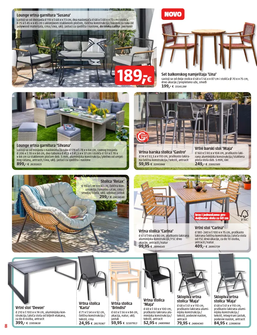 8 novo brzo i jednostavno pro- duljivanje stola za 60 cm lounge vrtna garnitura 'silvana' sastoji se od trosjeda s naslonima za ruke d 178 x š 78 x v 84 cm, ravnog trosjeda d 206 x š 78 x v 84 cm, dva taburea d 41,5 x š 41,5 x v 37 cm i stolića d 151 x š 78 x v 84 cm sa staklenom pločom deb. 5 mm, aluminijska konstrukcija / pletivo od umjet- nog ratana, antracit / siva, uklj. jastuci za sjedišta i naslone 899,- € 26351625 stolica 'relax' d 110 x š 96 x v 83 cm, čelična kon- strukcija / umjetni ratan, crna / smeđa / bijela, uklj. udoban jastuk 299,- € 29634149 vrtna barska stolica 'gastro' d 74 x š 53,5 x v 110 cm, praškasto lakira- na čelična konstrukcija / tekstil, antracit 59,95 € 32993848 vrtni barski stol 'maja' d 160 x š 90 x v 104 cm, praškasto laki- rana aluminijska konstrukcija / staklena ploča stola deb. 5 mm, sivi 249,- € 33002589 set balkonskog namještaja 'lina' sastoji se od dvije stolice d 68 x š 56 x v 87 cm i stolića ø 70 x v 75 cm, drvo akacije / prepleteno uže, smeđi 199,- € 33141288 vrtni stol 'devon' d 210 x š 100 x v 74 cm, aluminijska kon- strukcija / ploča stola od biljnih vlakana, za do 8 osoba, antracit 399,- € 33959630 vrtna stolica 'brindisi' d 60 x š 56 x v 84 cm, akacija, natur, uklj. jastuk 59,95 € 32107913 sklopiva vrtna stolica 'maja' d 68 x š 61 x v 110 cm, praškasto lakirana alumi- nijska konstrukcija / tekstil, podesivi naslon, antracit 79,95 € 24804345 sklopiva vrtna stolica 'maja' d 68 x š 61 x v 110 cm, praškasto lakirana alumi- nijska konstrukcija / tekstil, integrirani jastuk, podesivi naslon, antracit 84,95 € 22908056 vrtna stolica 'carina' d 61 x š 60 x v 86 cm, praškasto lakirana aluminijska konstrukcija / fsc drvo akacije, antracit / natur 99,95 € 26994145 vrtni stol 'carina' d 180 - 240 x š 100 x v 75 cm, praškasto lakirana čelična konstrukcija / ploča stola od fsc drva akacije, za do 10 osoba, antracit / natur 409,- € 26991739 lounge vrtna garnitura 'susana' sastoji se od dvosjeda d 119 x š 68 x v 73 cm, dva naslonjača d 68 x š 69 x v 73 cm i stolića d 75 x š 45 x v 45 cm s uklonjivom staklenom pločom, čelična konstrukcija / nasloni za ruke od polywood materijala, crna / siva, uklj. jastuci za sjedišta i naslone, do isteka zaliha 28679095 189, - € vrtna stolica 'maja' d 69 x š 59 x v 100 cm, praškasto lakirana alu- minijska konstrukcija / tekstil, antracit 52,95 € 24809960 vrtna stolica 'karla' d 71 x š 54 x v 92 cm, čelična konstrukcija / tekstil, crna 24,95 € 28170367