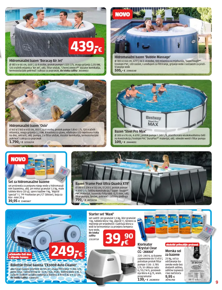 9 novo novo ekološki prihvatljiv proizvod učinkovito čisti dno i stijenke bazena hidromasažni bazen 'boracay air jet' ø 180 x v 66 cm, 669 l, za 4 osobe, protok pumpe 1.325 l / h, snaga grijanja 2,05 kw, 120 zračnih mlaznica 'air jet', uklj. filtar uložak, 'chemconnect®' dozator kemikalija, termoizolacijski pokrivač i zakrpa za popravak, do isteka zaliha 30148411 hidromasažni bazen 'bubble massage' ø 180 x v 66 cm, 677 l, za 2 - 4 osobe, 100 mlaznica za mjehuriće, 'supertough™' troslojni pvc, led zaslon, s uređajem za filtriranje, grijanje vode i sustavom za proči- šćavanje vode 595,- € 33964148 hidromasažni bazen 'oslo' d 160 x š 160 x v 65 cm, 850 l, za 4 osobe, protok pumpe 1.800 l / h, 120 zračnih mlaznica, snaga grijanja 2,2 kw, 4 naslona za glavu, višebojna led svjetlosna traka na dnu, antracit, uklj. pumpa, 2 x filtar uložak, dozator kemikalija, termoizolacijski pokrivač i zakrpa za popravak 1.790,- € 32516218 robotski čistač bazena 'zx500r auto cleaner' aku čistač bazena površine do 176 m², snaga filtriranja 11.356 l / h, perivi filtar, radna brzina 12 - 15 m / min, maks. dubina vode 2 m, s ručkom i kukom za lakše vađenje iz bazena, d 44 x š 42 x v 23 cm, do isteka zaliha 33847391 morska sol za bazene 25 kg, sol za održavanje ba- zenske vode bez dodanih aditiva, odlične topivosti i bez nečistoća 9,95 € 30761766 starter set 'maxi' set sadrži: ph granulat 1,5 kg, klor granulat 1 kg, tablete klora 1 kg, algicid 1 l, testere za mjerenje ph vrijednosti i sadržaja klora u vodi te termometar za provjeru tempera- ture vode, do isteka zaliha 23119718 bazen 'steel pro max' ø 305 x v 76 cm, 4.678 l, protok pumpe 1.249 l / h, plastificirana visokokvalitetna čelič- na konstrukcija / troslojni pvc 'duraplus™' materijal, uklj. odvodni ventil i filtar pumpa 109,- € 28444691 set za hidromasažne bazene set proizvoda za potpunu njegu vode u hidromasaž- nim bazenima, uklj. ph minus granulat 1,5 kg, male tablete klora (20 g), sporo topljive 1 kg, 'algicid special' 1 l, 'pp pooltester ph / cl' (blister), boja za klor - mini 20 g 39,95 € 33485667 bazen 'frame pool ultra quadra xtr' d 549 x š 274 x v 132 cm, 17.203 l, protok pumpe 4.500 l / h, čelična konstrukcija / 'super - tough™' pvc materijal, bazenska folija deb. 0,73 mm, uklj. filtar pumpa, ljestve, pokrivač i zaštitna podloga 799,- € 28759216 439, - € 249, - € 39 , € 90 klorinator 'krystal clear cg - 26664' 220 - 240 v, za bazene zapremnine do 17.413 l, potreban protok filtar pumpe 1.136 - 3.785 l / h, tri ciklusa rada: 6 / 10 / 14 h, proizvod- nja klora 4 g / h, vrem. programator 139,- € 28286954