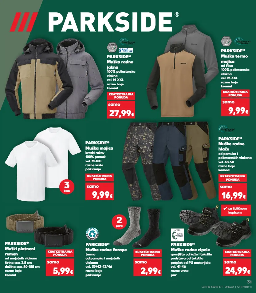 3 kom kratkotrajna ponuda samo 16,99 € kratkotrajna ponuda samo 9,99 € parkside ® muška majica kratki rukav 100% pamuk vel. m-xxl razne vrste pakiranje kratkotrajna ponuda samo 9,99 € parkside ® muške radne hlače od pamuka i poliesterskih vlakana vel. 48-58 razne boje komad kratkotrajna ponuda samo 27,99 € parkside ® muška radna jakna 100% poliesterska vlakna vel. m-xxl razne boje komad parkside ® muška termo majica od flisa 100% poliesterska vlakna vel. m-xxl razne boje komad parkside ® muške radne cipele gornjište od kože i tekstila podstava od tekstila potplat od pu materijala vel. 41-46 razne vrste par kratkotrajna ponuda samo 24,99 € 2 para parkside ® muški platneni remen od umjetnih vlakana širina cca. 3,8 cm dužina cca. 80-155 cm razne boje komad kratkotrajna ponuda samo 5,99 € parkside ® muške radne čarape termo od pamuka i umjetnih vlakana vel. 39/42-43/46 razne boje pakiranje kratkotrajna ponuda samo 2,99 € ✓ sa čeličnom kapicom s31-hr-kw45-lft-online2_1_12_r-1030-11 31